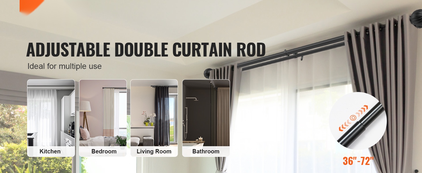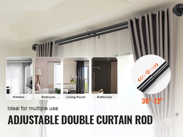 Kaksoisverhotanko sopii erilaisiin tiloihin – olohuoneeseen, makuuhuoneeseen, kylpyhuoneeseen, keittiöön tai työhuoneeseen. Säädettävä pituus 36–72 tuumaa poistaa rajoitteita eri ikkunakokojen välillä ja antaa enemmän vaihtoehtoja sisustukseen ja valon hallintaan.