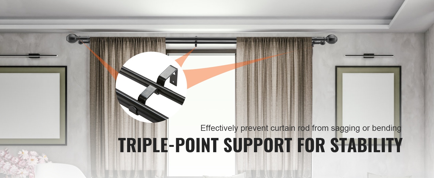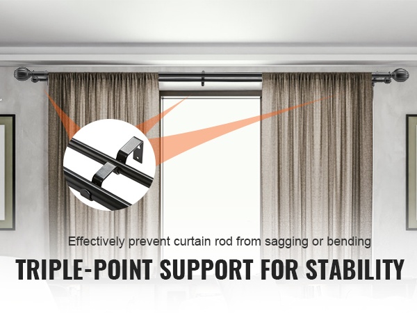 Pakkaukseen sisältyy kolme kiinteää seinäkannatinta, jotka jakavat kuorman tasaisesti. Tämä auttaa estämään tangon notkumista tai taipumista, erityisesti silloin kun verhot ovat pitkiä tai painavia tai kun käytössä on sekä pimentävät että läpikuultavat verhot yhtä aikaa.