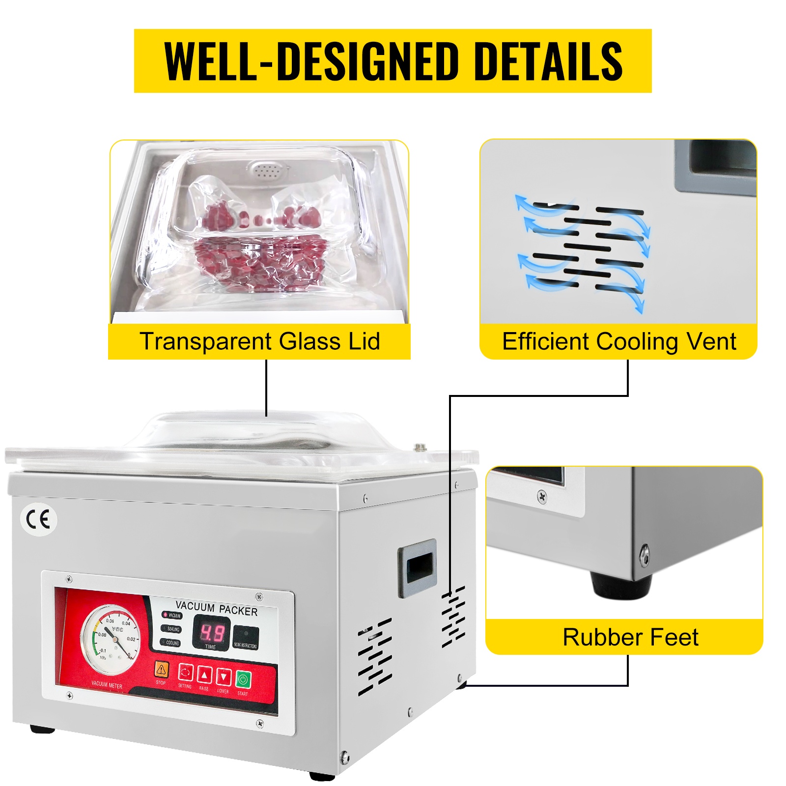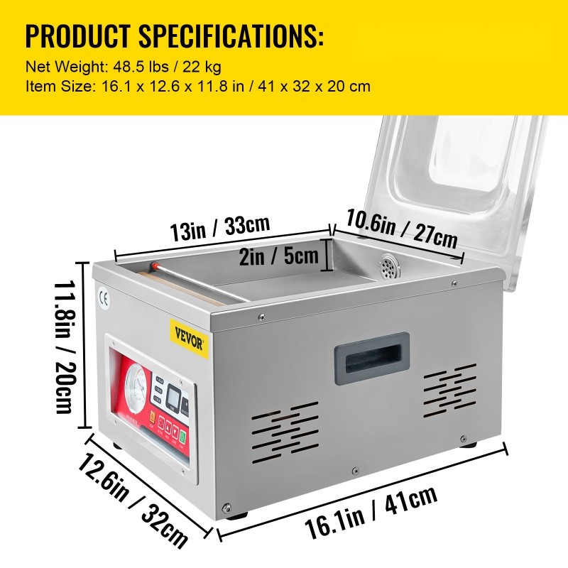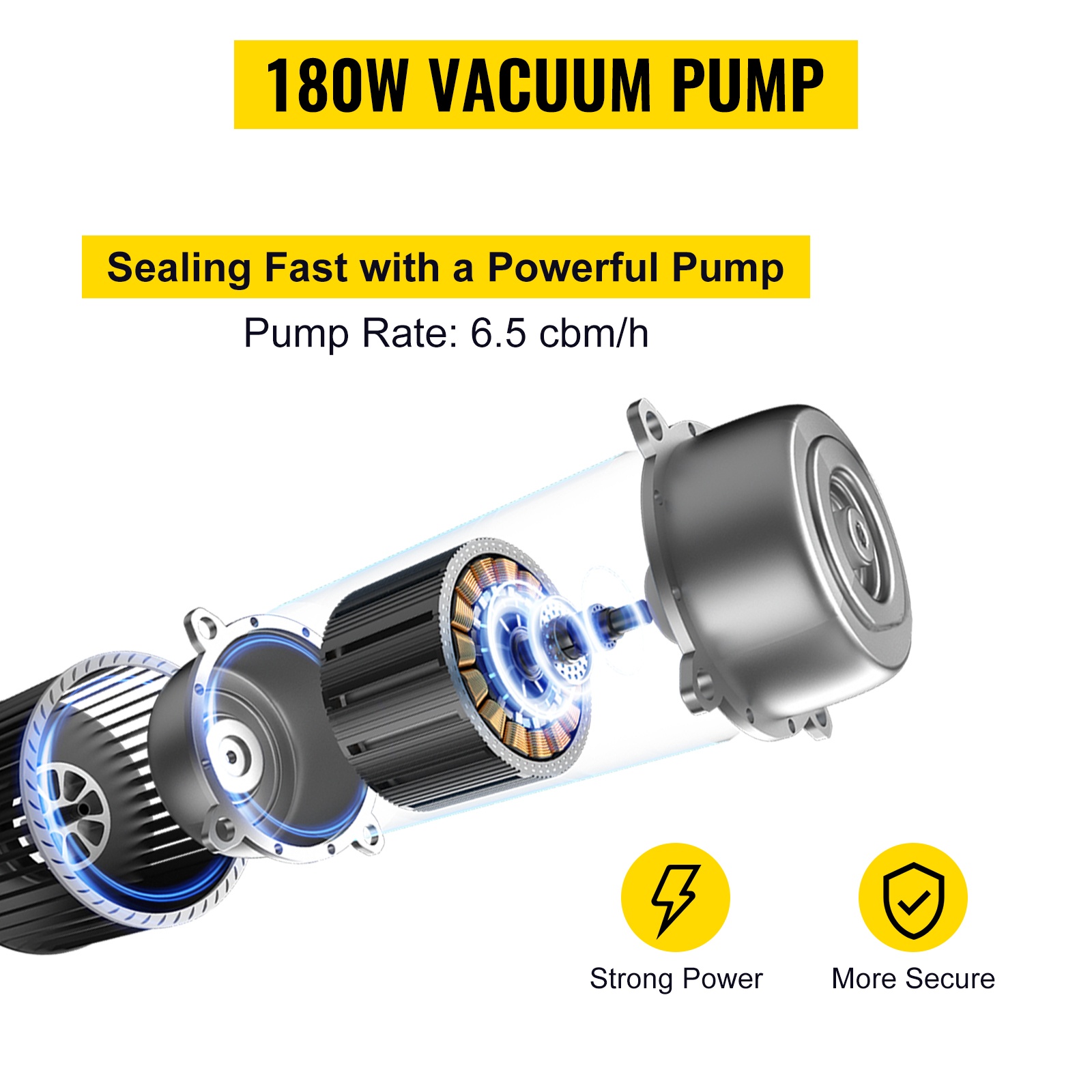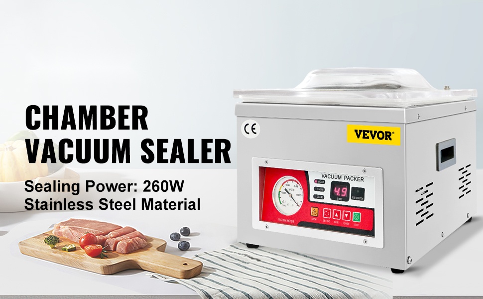 Vakuumikammio on varustettu tehokkaalla moottorilla nopeaa ilmanpoistoa varten. Kestävä ruostumaton teräs varmistaa pitkän käyttöiän. Alipaineen voimakkuus on 100KPa, joten laite selviytyy vaivatta useimmista pakkaustarpeista. Käyntiääni on enintään 70dB, mikä tekee käytöstä miellyttävää.