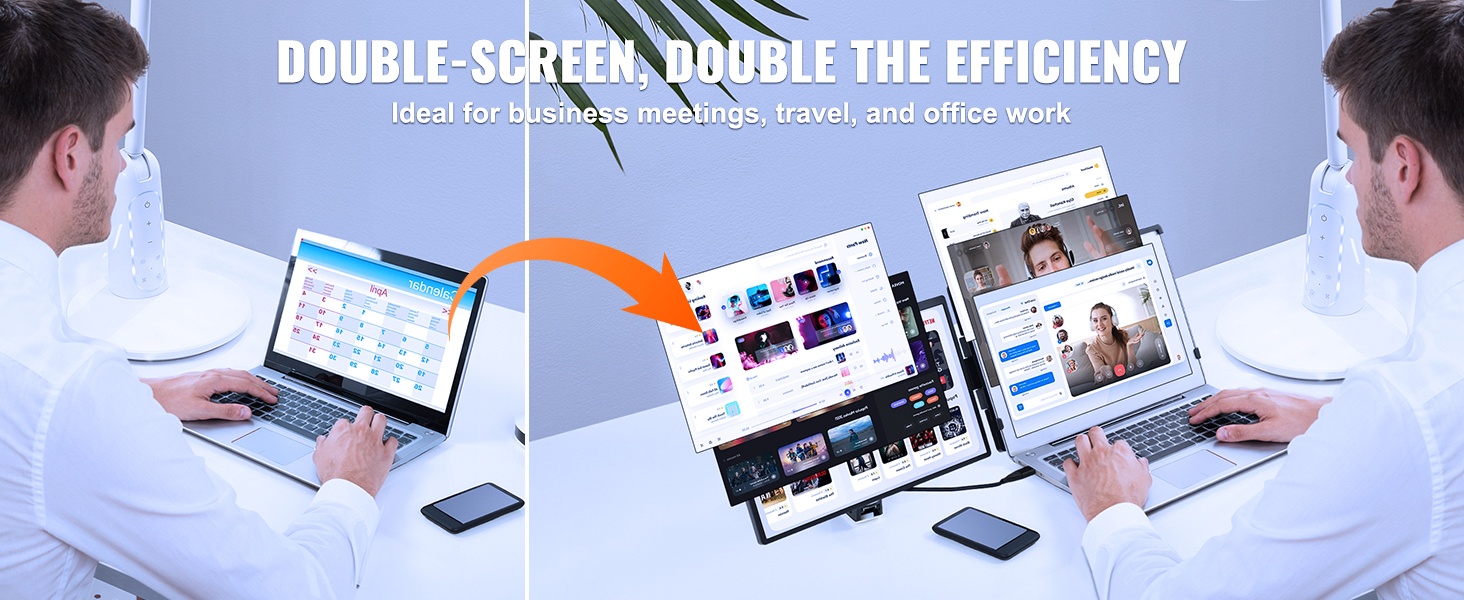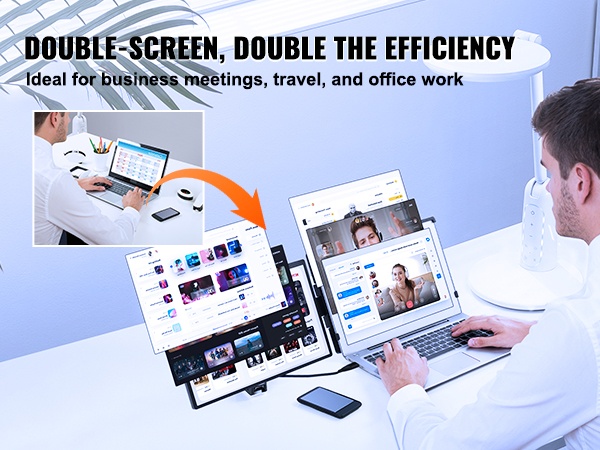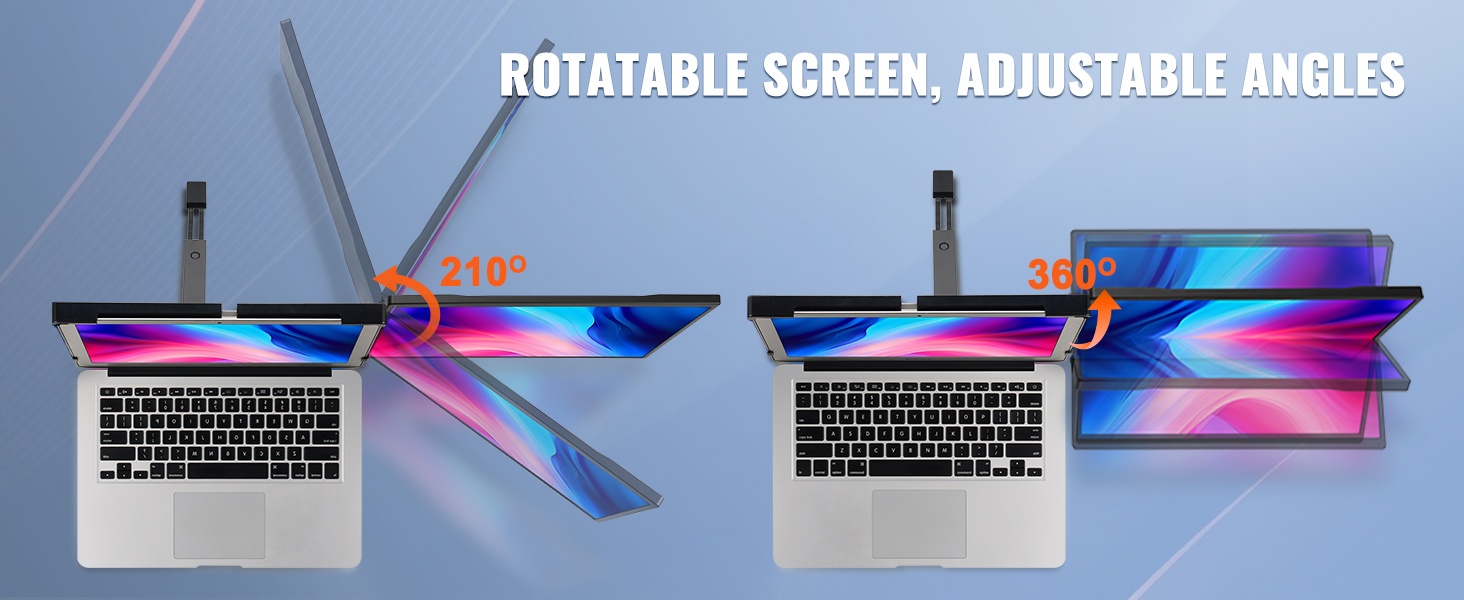 Näyttölaajennin kiinnittyy suoraan kannettavaan tietokoneeseen moninäyttökäyttöä varten ja kääntyy jopa 210°. Sen voi sijoittaa tarpeen mukaan joko kannettavan vasemmalle tai oikealle puolelle, mikä sopii hyvin videoneuvotteluihin, toimistotyöhön ja matkakäyttöön.