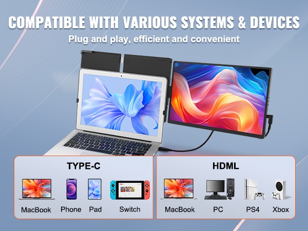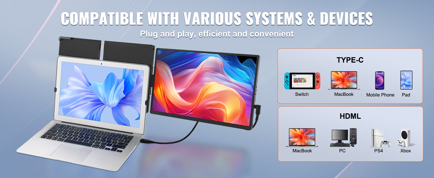 Näyttö on yhteensopiva monien laitteiden kanssa, kuten Android-, Windows-, Harmony OS- ja MAC OS -järjestelmien kanssa. Jokainen näyttö kytkeytyy yhdellä Type-C -kaapelilla tai HDMI+USB -yhdistelmällä, joten käyttöönotto on nopeaa ja suoraviivaista.