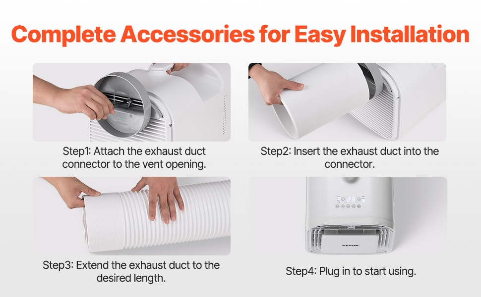 Pakkaukseen sisältyy poistoletkuja, poistoaukkoja ja useita asennustarvikkeita. Selkeiden vaiheiden ansiosta laitteen käyttöönotto käy nopeasti ja vaivattomasti.