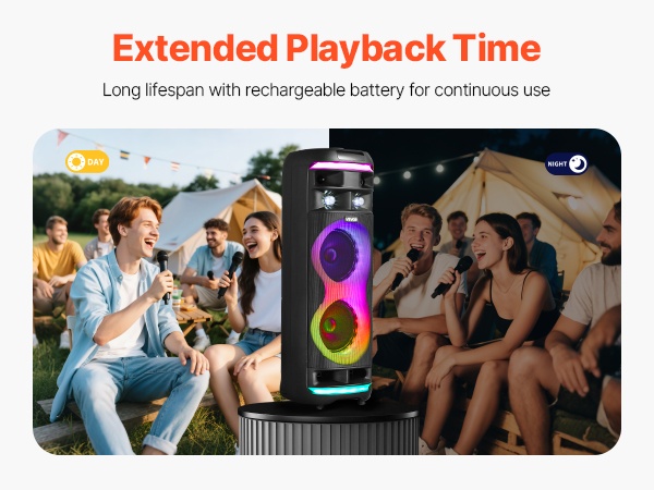 Kaiuttimessa on sisäänrakennettu ladattava akku, joka kuluttaa vähän energiaa ja mahdollistaa jatkuvan musiikintoiston. Latauksen aikainen toistotila varmistaa, ettei musiikki keskeydy pidemmissäkään karaokehetkissä.