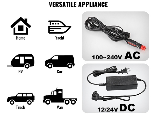 Mukana tulee 138-tuumainen / 3.5 m auton tupakansytytinjohto sekä verkkovirtaan soveltuva muunnospistoke, joten voit käyttää laitetta kotona, veneessä, matkailuautossa, autossa, kuorma-autossa, pakettiautossa ja monissa muissa ajoneuvoissa.