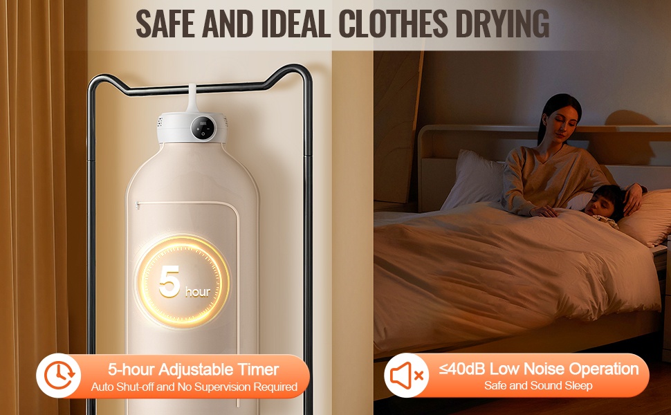 Kuivausaika voidaan säätää 30–300 minuutin välille vaatteiden paksuuden ja kosteuden mukaan. Laite sammuu automaattisesti ohjelman lopussa ja toimii hiljaisesti, enintään ≤40dB, eikä häiritse unta tai arjen tekemisiä.