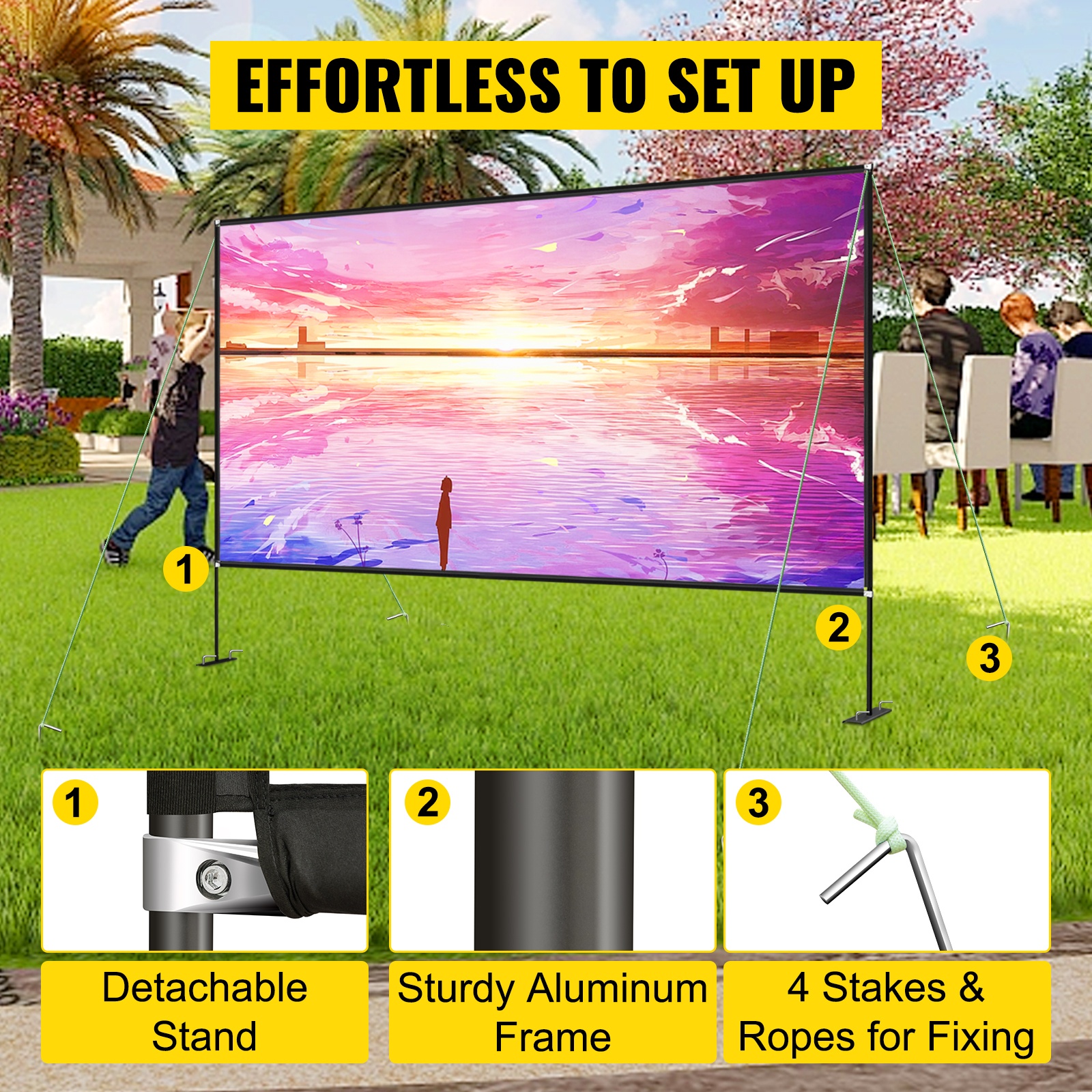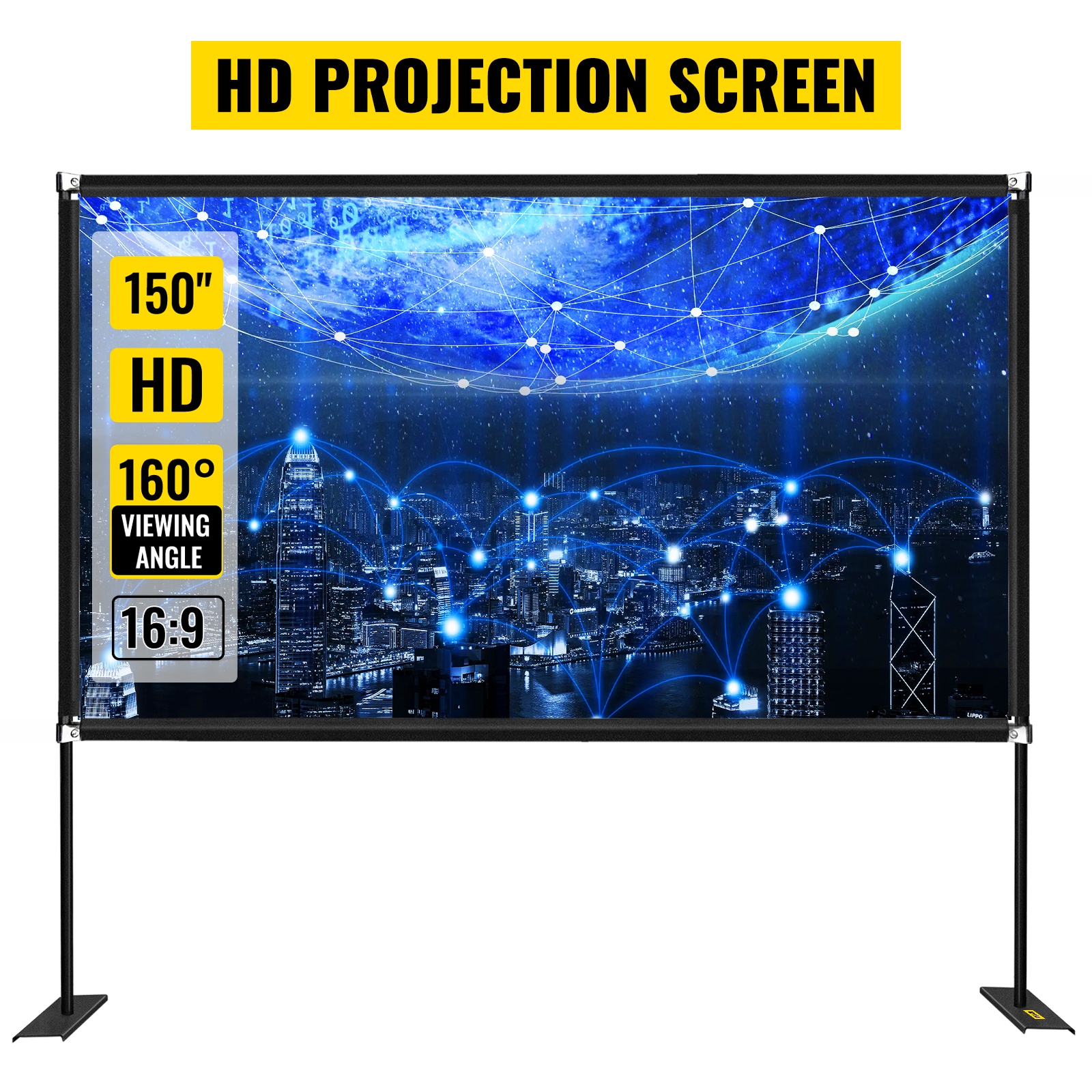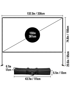 150" kannettava valkokangas telineellä tarjoaa 16:9-kuvasuhteen, terävän HD-kuvan ja 160 asteen katselukulman ulko- ja sisäkäyttöön. Korkealaatuinen oxford-kangas parantaa kuvan kirkkautta ja selkeyttä, ja alumiini–terästeline on kevyt mutta tukeva. Valkokangas on helppo koota ja purkaa sekä kuljettaa mukana mukana tulevassa säilytyslaukussa.