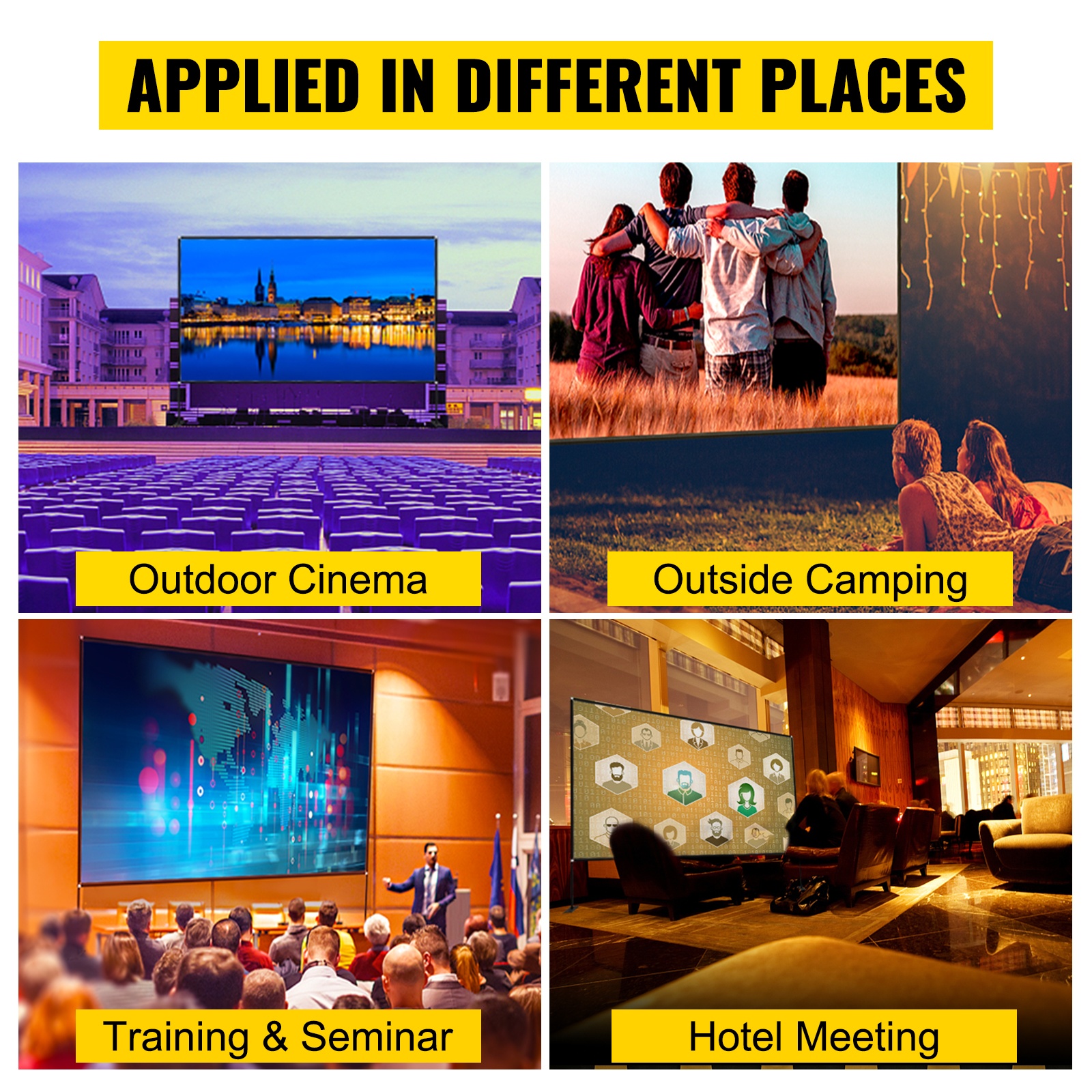 Valkokangas telineellä sopii ulkoelokuviin, leirintäalueille, koulutuksiin ja seminaareihin, hotellien kokoustiloihin, juhlasaleihin, esityksiin ja muuhun käyttöön, jossa tarvitaan suurikokoista kuvaa.