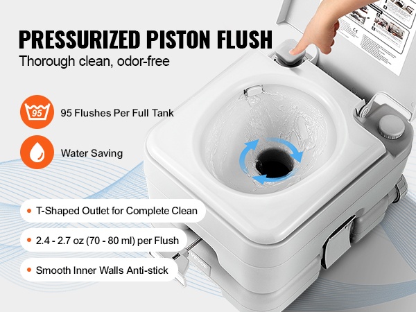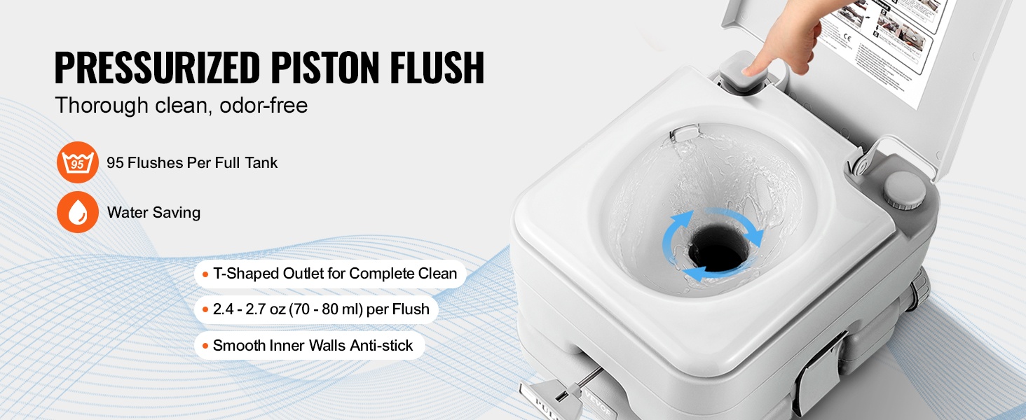 Paineistettu huuhtelupumppu puhdistaa tehokkaasti jätteen käyttämällä vain 3.4–3.6 oz (100–105 ml) vettä huuhtelua kohden. Säiliön tilavuus riittää noin 95 huuhteluun, mikä vähentää veden täyttötarvetta ja auttaa säästämään vettä.