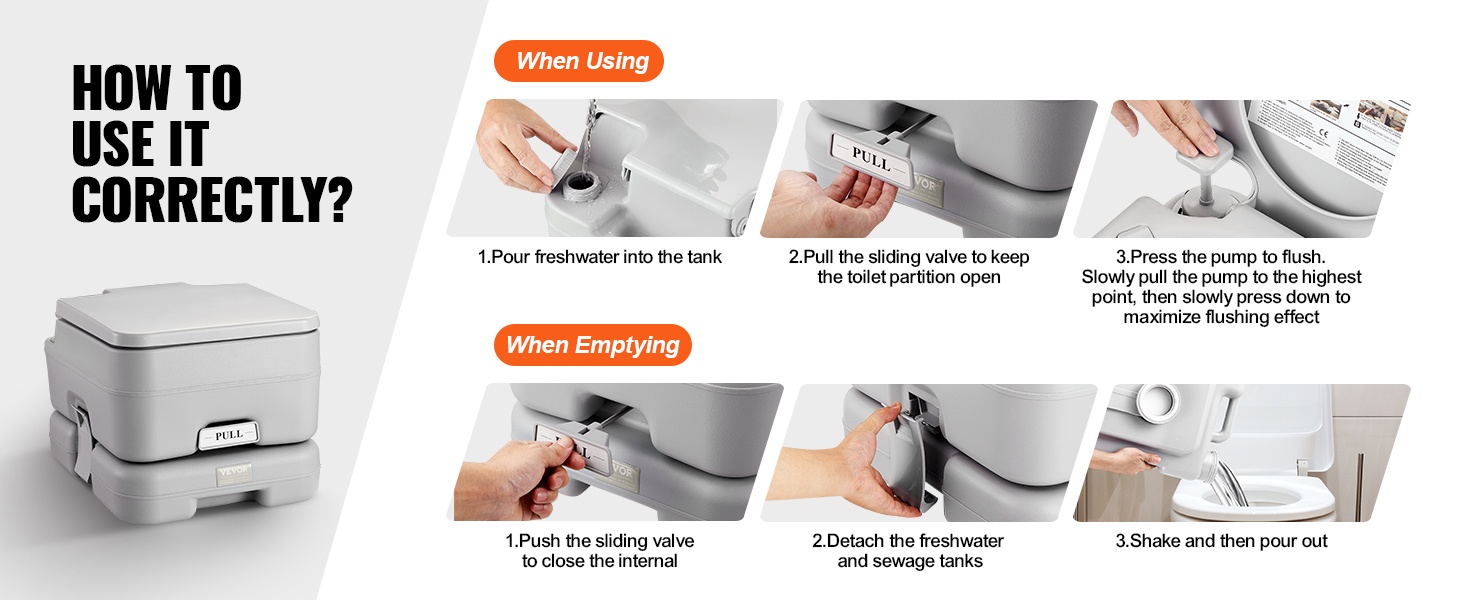 Irrotettava kuivakäymälä on helppo ottaa käyttöön: lisää vain vesi ja liu’uta venttiiliä avataksesi sisäisen väliseinän. Tämän jälkeen WC on valmis käytettäväksi esimerkiksi asuntoautossa tai leirintäkäytössä.