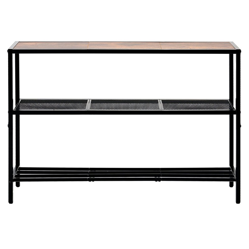 Kapea kolmitasoinen konsolipöytä, tukeva hiiliteräsrunko ja melamiinipinnoitetut MDF-hyllyt. Säädettävät jalat, kaadonsuoja, hillitty ruskea ja musta viimeistely. Antaa runsaasti säilytystilaa pienessä tilassa, kantavuus 45 kg, helppo puhdistaa.