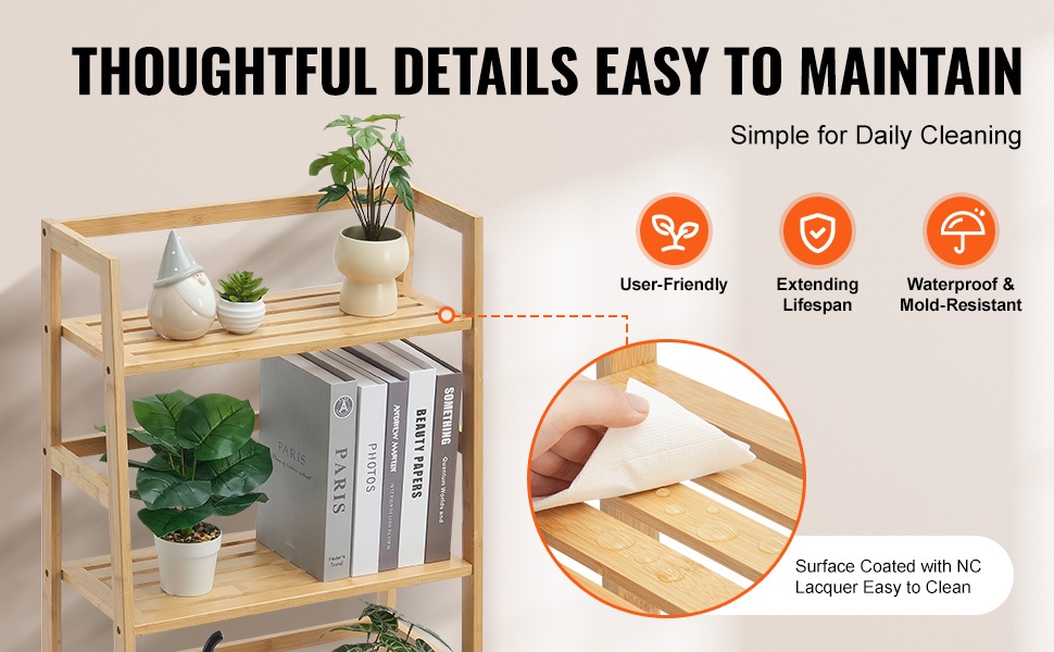 - Monikäyttöinen: kirjahylly, kasviteline, kylpyhuone- tai säilytyshylly