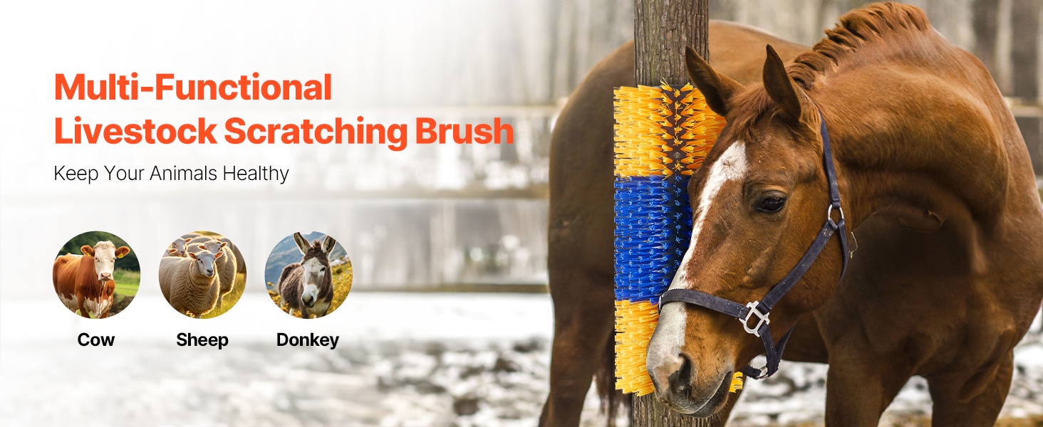 Tämä karjan rapsutusharja auttaa eläimiä hoitamaan turkkiaan, pitämään ihon puhtaana ja helpottamaan kutinaa. Harjan tiheät, pehmeät harjakset sopivat lehmille, lampaille, hevosille, peuroille ja sioille vahingoittamatta karvaa. Mukana tulevilla ruuveilla harjan saa kiinnitettyä tukevasti seinään tai tolppaan. Harja on helppo käyttää ja puhdistaa, ja se sopii hyvin päivittäiseen karjanhoitoon.