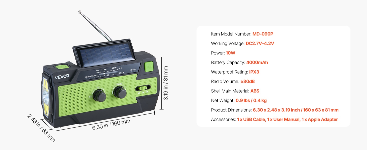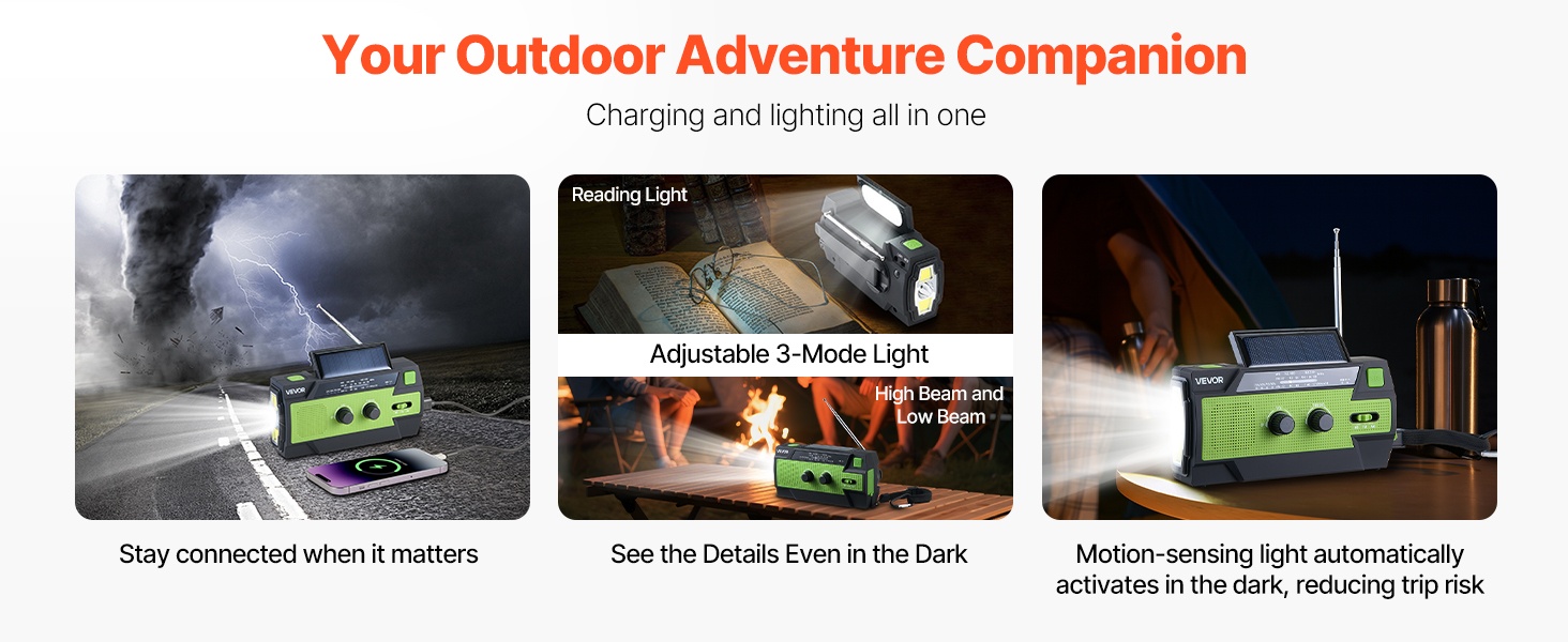 Aurinkopaneelilla ja käsikammella varustettu hätäradio tukee FM/AM/WB- ja NOAA-hälytyskanavia, jotta saat viralliset päivitykset ennen myrskyjä ja muita ääriolosuhteita. Neljän virtalähdevaihtoehdon (käsikampi, aurinkopaneeli, USB ja sisäinen akku) ansiosta radio pysyy toiminnassa myös sähkökatkojen aikana.
