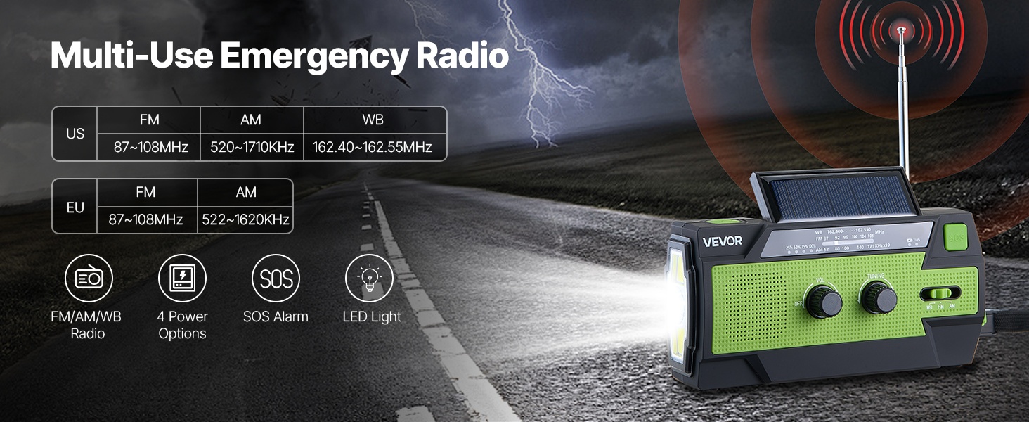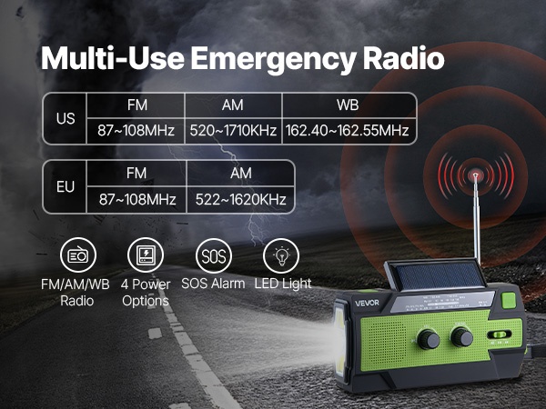 Tämä aurinkokennolla varustettu käsikampikäyttöinen hätäradio tarjoaa FM/AM/WB- ja NOAA-hälytyskanavat, jotta voit kuunnella viranomaisviestejä ennen kuin myrskyt tai muut luonnonkatastrofit iskevät. Neljän eri virtalähteen ansiosta radioa voi käyttää monipuolisesti sekä arjessa että hätätilanteissa.