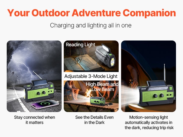Radio yhdistää useita toimintoja yhteen laitteeseen: tehokas taskulamppu, lataustoiminto mobiililaitteille sekä liikeanturi, joka sytyttää valon liikkeen havaitessaan. Se sopii sekä hätävarusteeksi että ulkoiluun, kuten leirintään, patikointiin ja retkeilyyn.