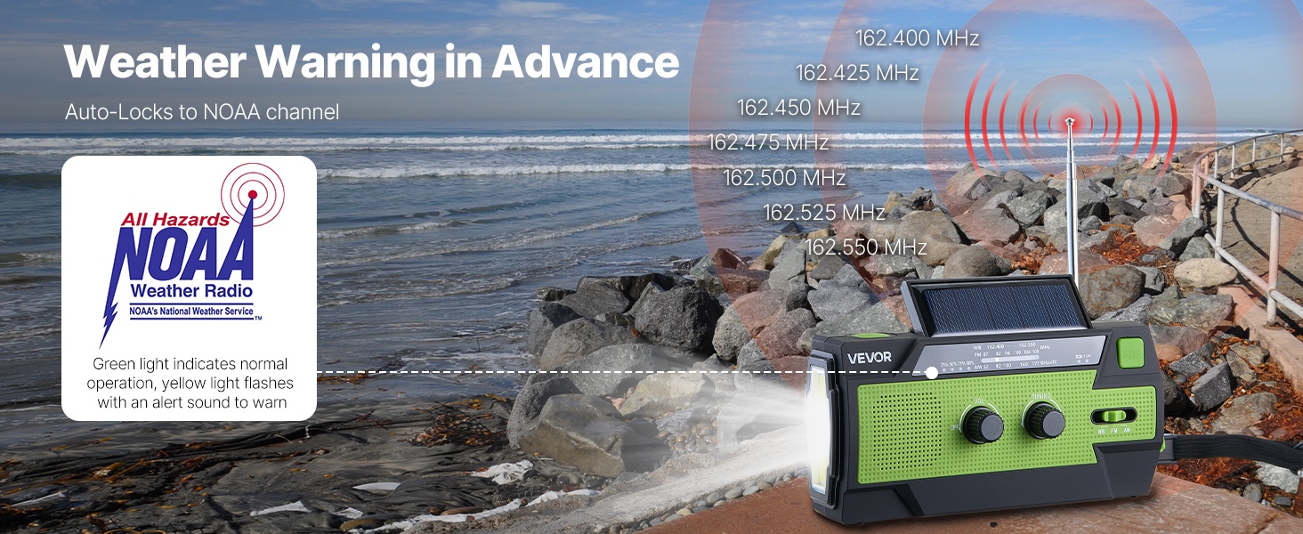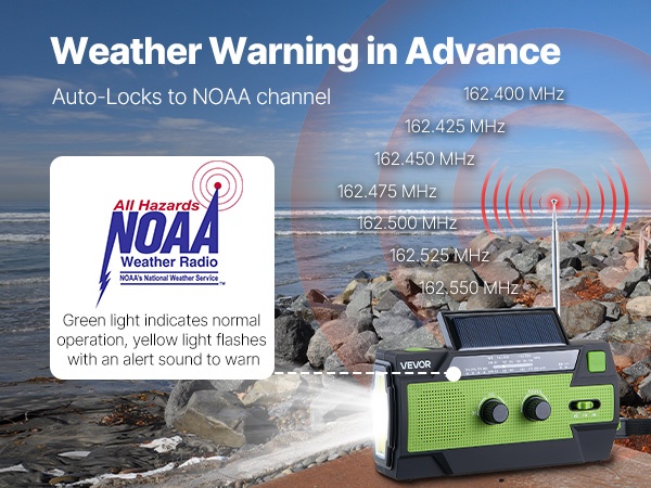 Käsikampiradio lukittuu automaattisesti NOAA-kanaville. Vihreä merkkivalo ilmaisee selkeän signaalin ja keltainen merkkivalo varoitustilanteen. Näin saat ajoissa ilmoituksia esimerkiksi hirmumyrskyistä, tornadoista, tsunameista, tulvista ja muista vakavista sääilmiöistä.