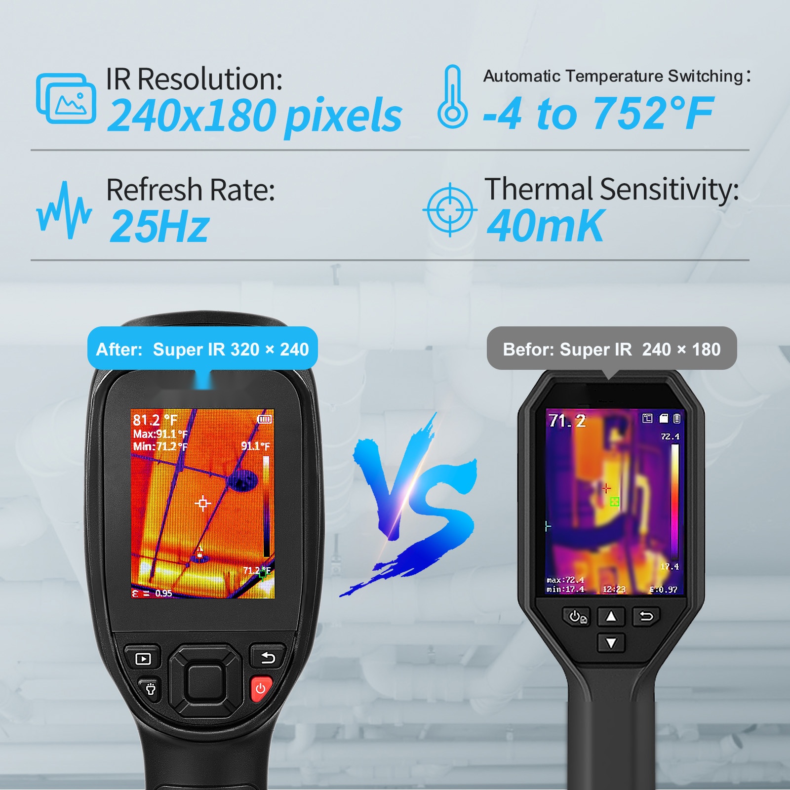 Kädessä pidettävä lämpökamera, jossa on 320 x 240 pikselin supertarkkuus ja 240 x 180 IR-resoluutio, auttaa paikallistamaan lämpötilaerot nopeasti ja tarkasti. 2 megapikselin näkyvän valon kamera parantaa yksityiskohtia, ja 25Hz virkistystaajuus tekee lämpökuvista sujuvia. Pitkäkestoinen ladattava litiumioniakku (jopa 11h) ja 64G SD-kortti tarjoavat hyvän tuen säännöllisiin tarkastuksiin kotona, LVI-järjestelmissä, sähköasennuksissa, putkistoissa ja kunnossapidossa.