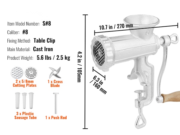 304-ruostumattomasta teräksestä valmistettu käsikäyttöinen lihamylly on purettavissa osiin ja helppo puhdistaa käytön jälkeen. Kokoaminen tapahtuu järjestyksessä: pään mutteri, reikälevy, ristitera, ruuvikierrepää, ruuvikierre, holkki, runko, runkopuristin ja kampi.