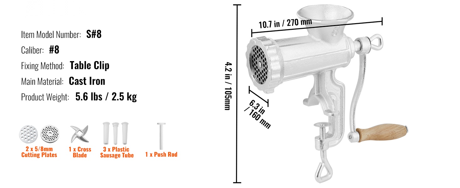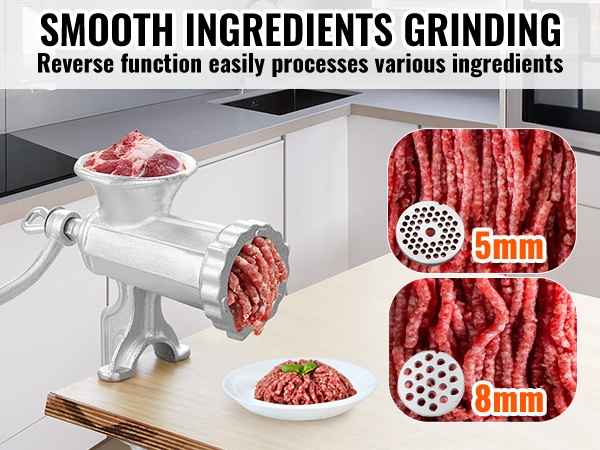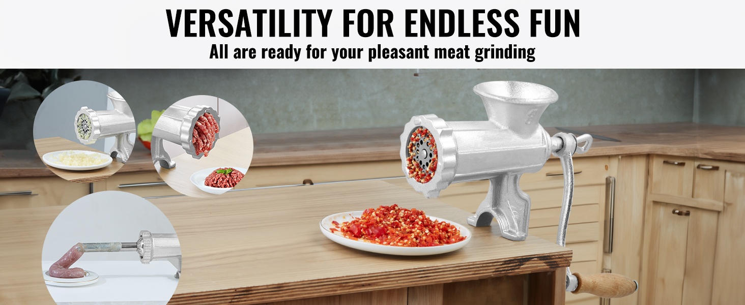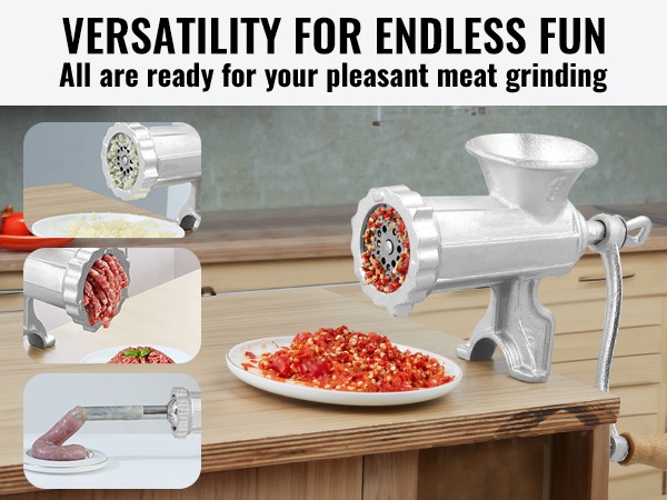 Mukana tulevat 5mm ja 8mm reikälevyt, jauhatuspää, keksimuotti, makkarasuppilo ja muut lisäosat mahdollistavat erilaisten raaka-aineiden käsittelyn. Voit jauhaa monenlaista lihaa ja vähävetisiä vihanneksia sekä valmistaa kotitekoisia makkaroita ja keksejä.