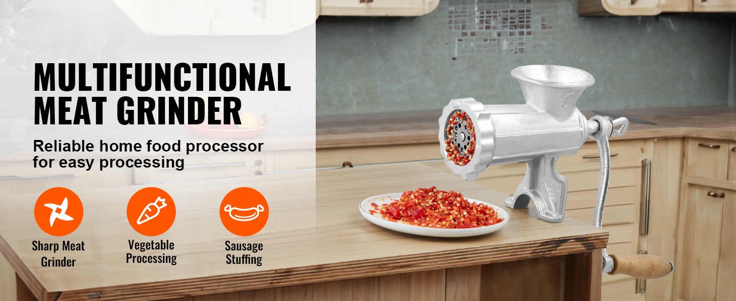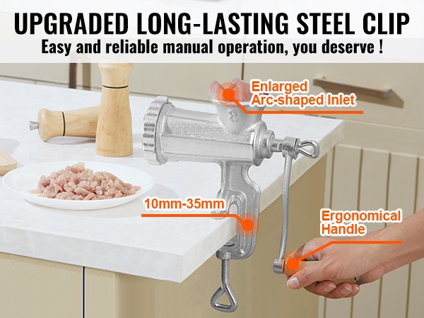 Käsikäyttöinen lihamylly 304-ruostumattomasta teräksestä helpottaa kotitekoisten ruokien, kuten jauhelihan, makkaran ja keksitaikinan valmistusta. Tukevan rakenteen ja kahden kiinnitystavan ansiosta mylly pysyy vakaasti paikoillaan käytön aikana.