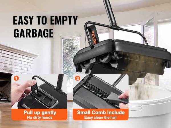 Keräyssäiliön tyhjennys onnistuu helposti nostamalla salpa, jolloin roskat putoavat suoraan jäteastiaan ja kädet pysyvät puhtaina. Mukana tulevalla pienellä puhdistuskammalla voi poistaa harjaan tarttuneet hiukset ja karvat.