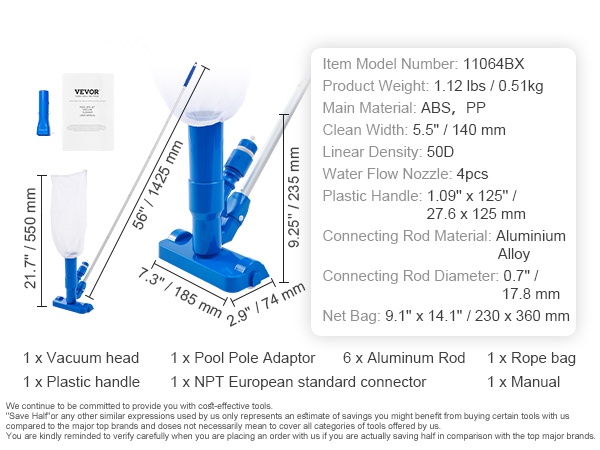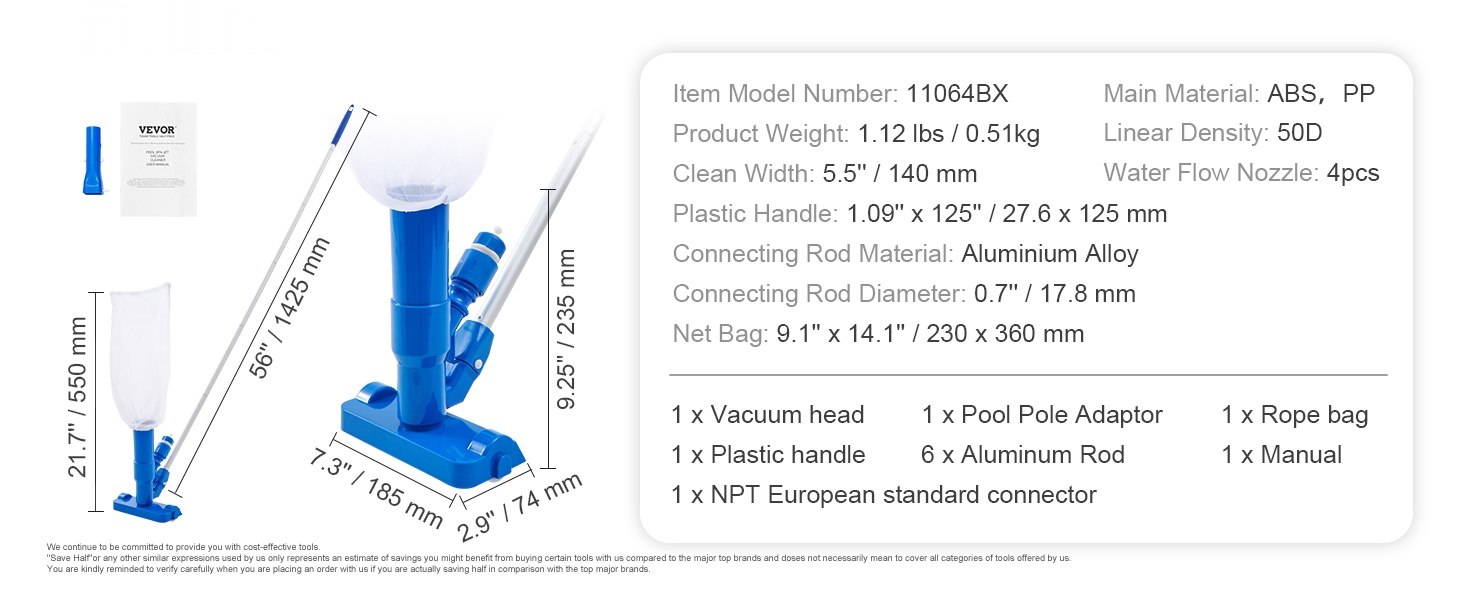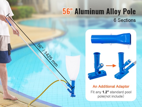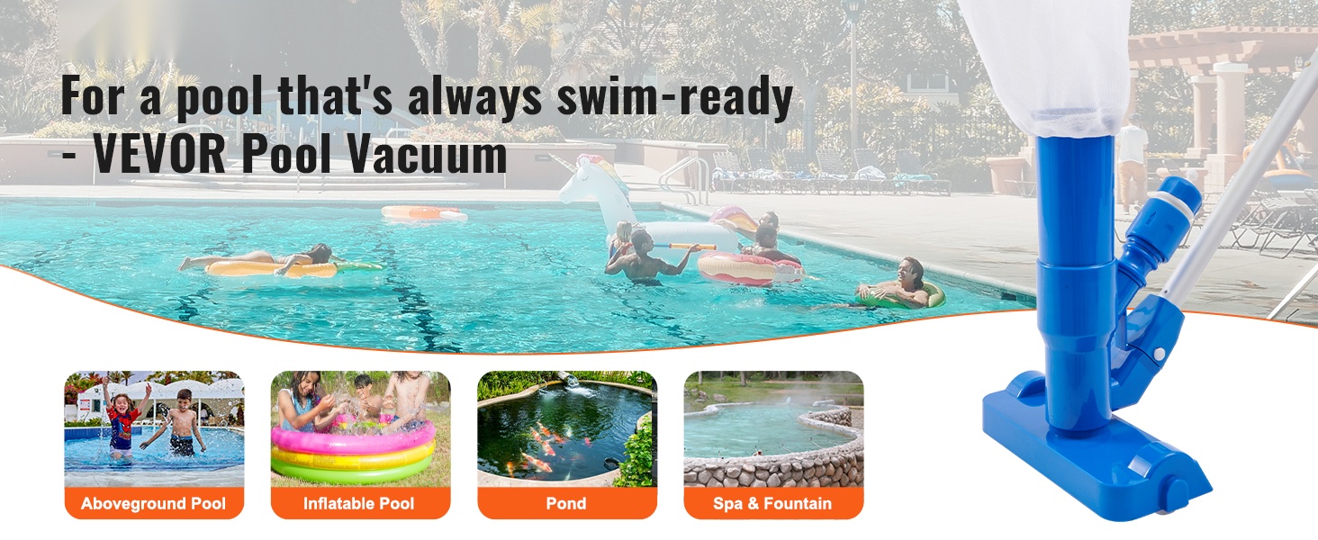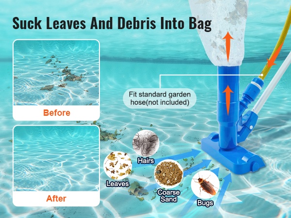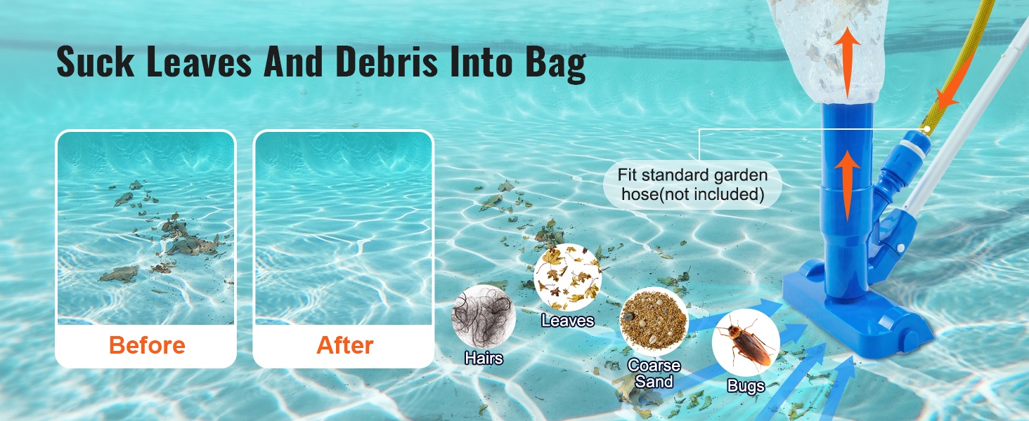 Tämä kannettava uima-altaan imuri käyttää vedenpainetta roskien imemiseen keräyspussiin ilman sähköä. Se sopii erinomaisesti maanpäällisten uima-altaiden, porealtaiden, puhallettavien altaiden, lampien ja suihkulähteiden puhdistukseen.