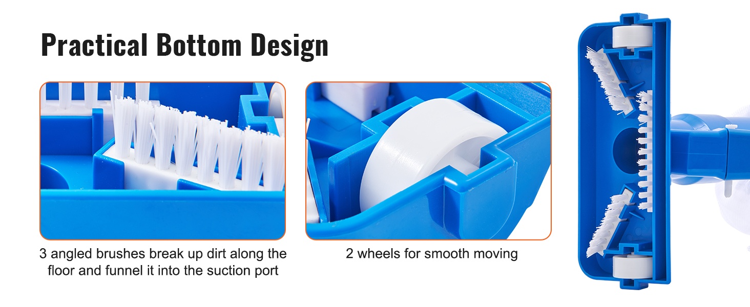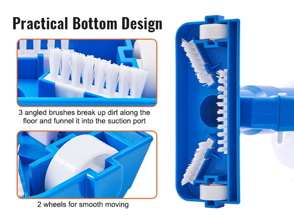 Varren päähän kiinnitettävä W-harja irrottaa itsepäisen lian ja roskat, jolloin ne on helppo imeä pois. Pohjassa olevat kaksi pyörää varmistavat tasaisen ja kevyen liikkeen veden alla.