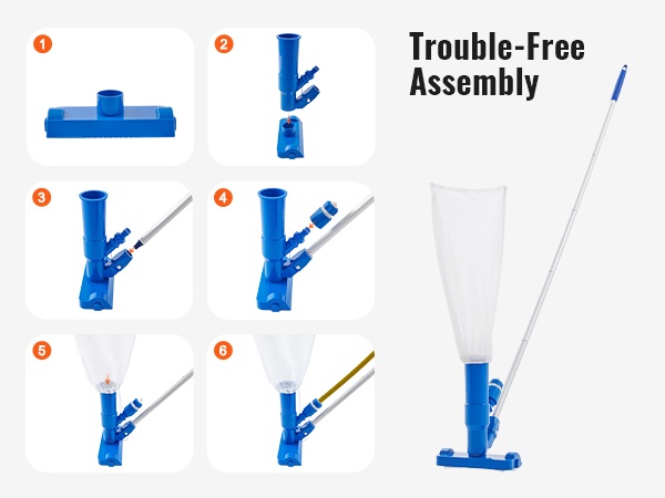 Puhallettavan altaan puhdistin on helppo koota ja käyttää mukana tulevien ohjeiden avulla. Monimutkaista asennusta ei tarvita. Koko setin voi purkaa osiin, jolloin se vie vain vähän tilaa ja on helppo säilyttää.