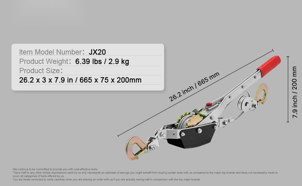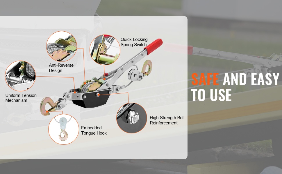 Tämä käsitalja on suunniteltu raskaiden kuormien vetämiseen ja siirtämiseen vaivattomasti. Se sopii esimerkiksi ajoneuvojen pelastamiseen, materiaalien siirtämiseen, kantojen poistoon tai raskaiden huonekalujen liikuttamiseen. Yksiosainen vaihderakenne varmistaa sujuvan liikkeen ja tukevan otteen kuormasta.