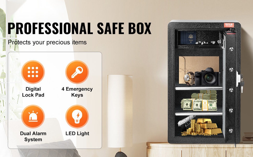 Kassakaappi antaa hälytyksen, jos väärä salasana näppäillään 3 kertaa tai jos kaappiin kohdistuu voimakas isku. Tämä lisää suojausta ja auttaa estämään luvattoman käytön.
