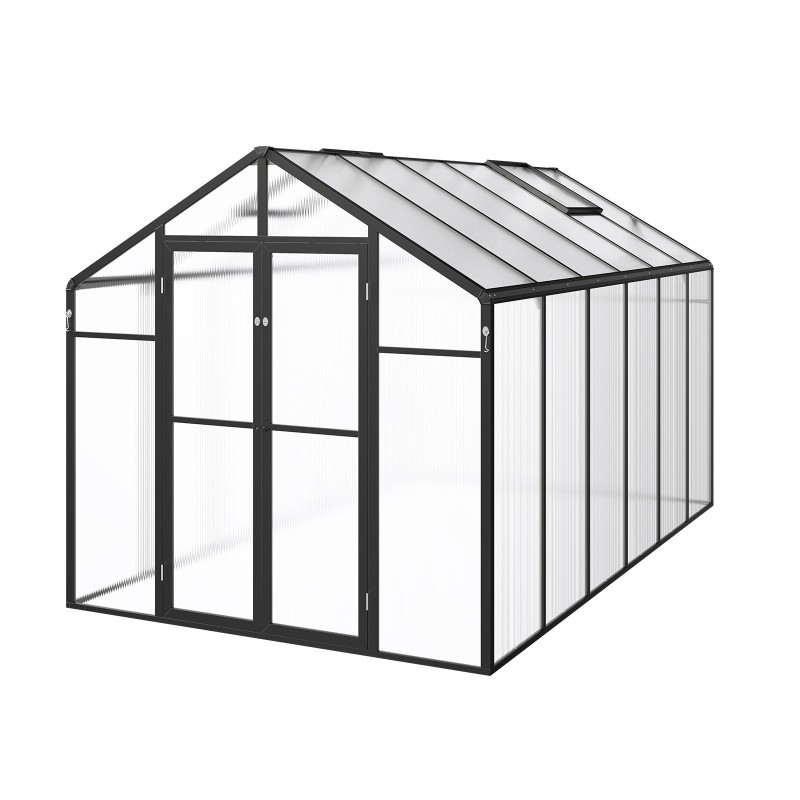 Tämä polykarbonaatista valmistettu kasvihuone tarjoaa kestävän alumiinirungon ja iskunkestävät PC-paneelit, joiden valonläpäisy on 89 % ja jotka suojaavat UV-säteilyltä. Suuret avautuvat ovet ja säädettävät kattoikkunat takaavat tehokkaan tuuletuksen ja ehkäisevät kasvien mätänemistä. Kasvihuonetta voi käyttää myös viherhuoneena tai puutarhapaviljonkina pihalla.