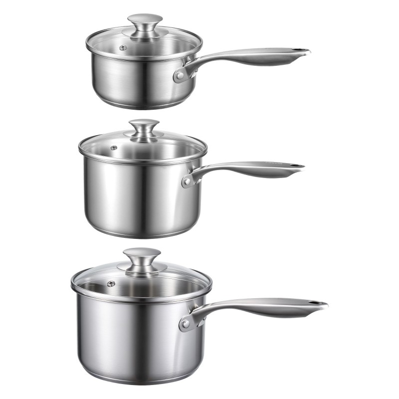 Monikäyttöinen, pinnoitteeton ruostumattomasta teräksestä valmistettu kattilasetti arjen ruoanlaittoon. Setti sisältää 1 QT, 2 QT ja 3 QT kasarit lasikansilla, jotka sopivat hyvin pienille annoksille, pariskunnille ja pienille perheille. Kattiloita voi käyttää liedellä, uunissa ja ne kestävät konepesun.
