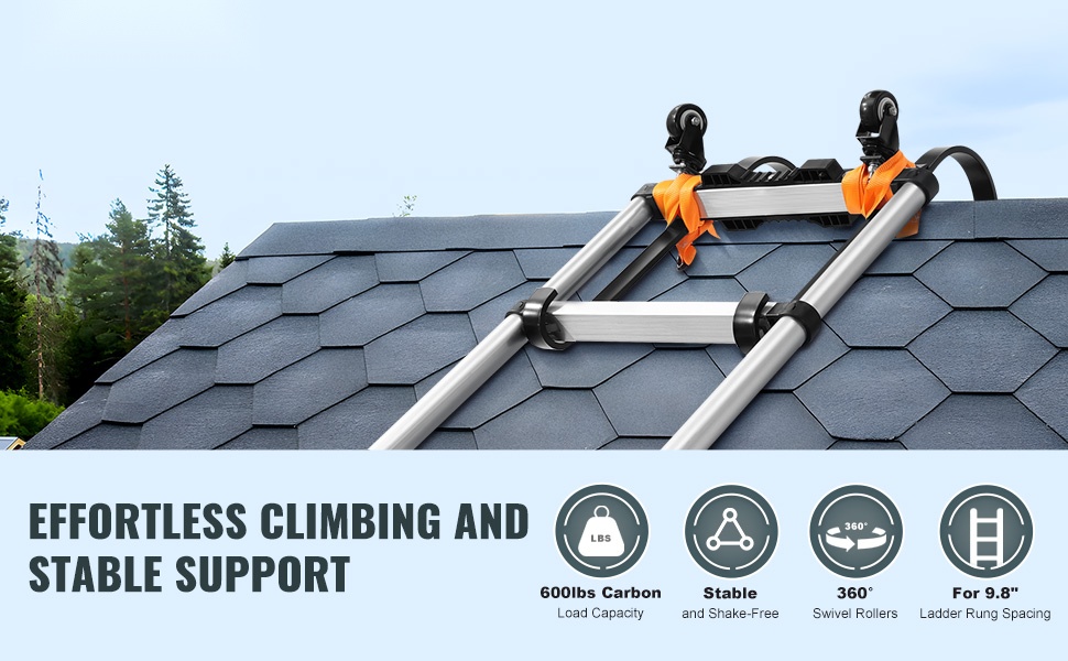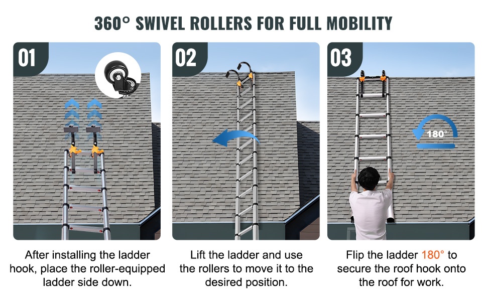 360° kääntyvät pyörät helpottavat tikkaiden siirtämistä oikeaan asentoon. Kun koukku on asennettu harjalle, tikkaat voidaan vetää turvallisesti paikoilleen ilman tarpeetonta nostamista.