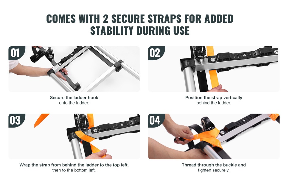 Pakkaukseen sisältyy 2 kiinnitysremmiä, joilla tikkaat voidaan sitoa tiukasti paikoilleen. Tämä parantaa vakautta ja vähentää liukumisen riskiä korkealla työskennellessä.