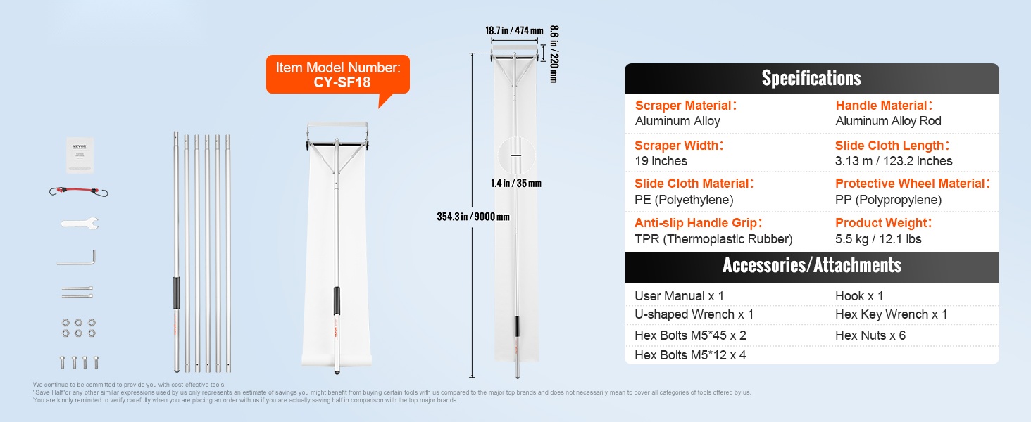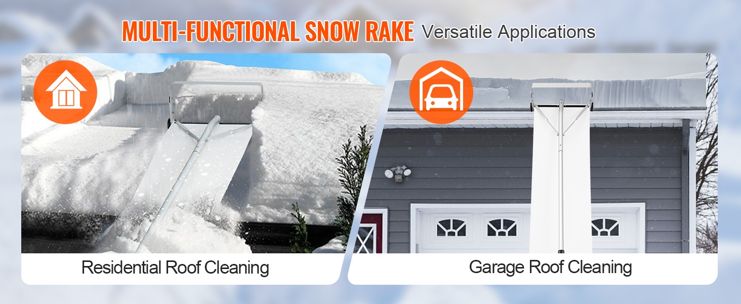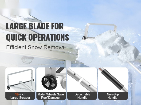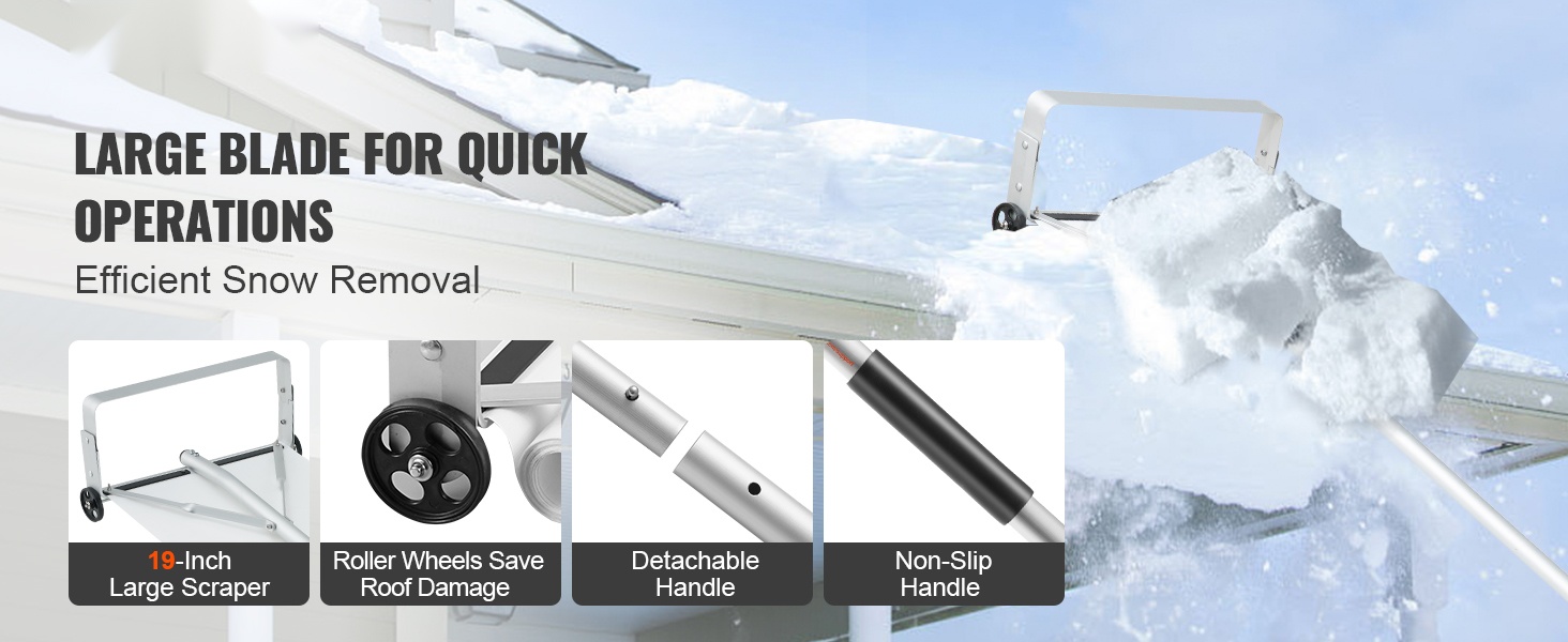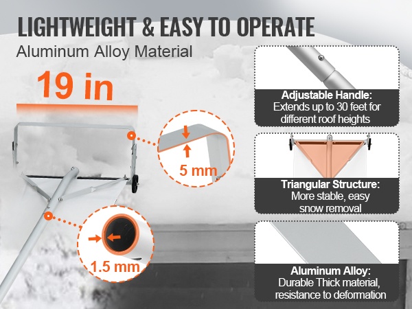 Pituus on säädettävissä 5–21 jalkaa, joten voit poistaa kertyneen lumen katolta turvallisesti maasta käsin ilman tikkailla kiipeämistä. Liukuvat suojapyörät auttavat estämään katon naarmuuntumisen, ja liukuestepinnoitteella varustettu kahva takaa tukevan otteen liukkaissakin olosuhteissa.