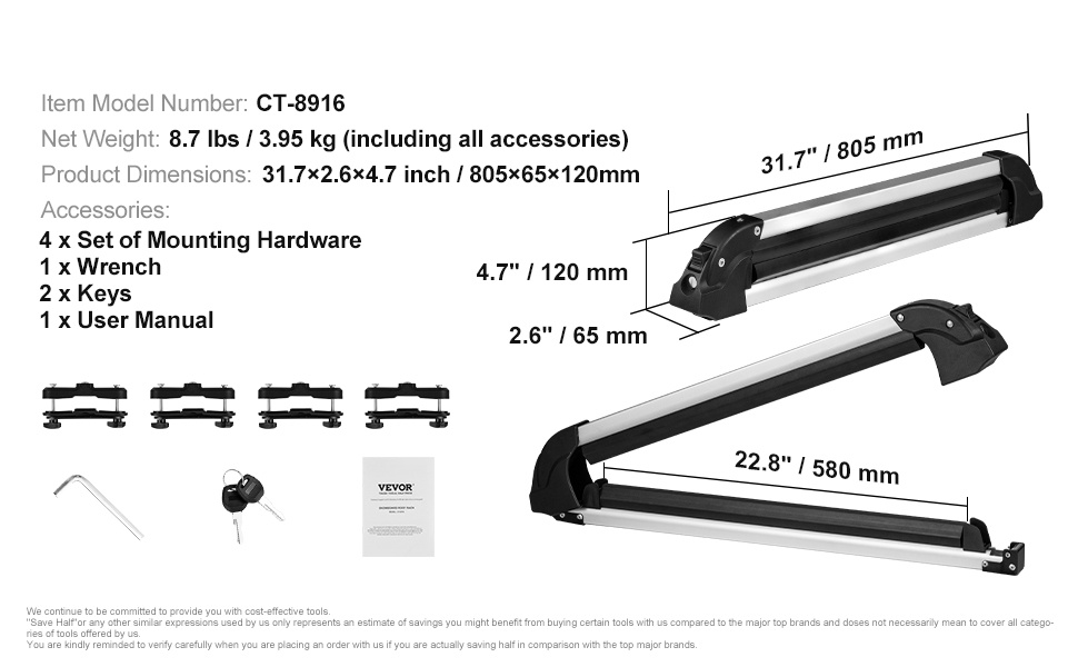 - Yhteensopiva useimpien poikittaiskattotelineiden kanssa (suositeltu poikkipalkin koko < 3.9 x 1.2 tuumaa / 100 x 30 mm)