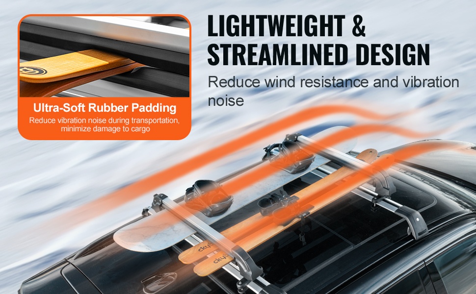 22.8-tuumainen kumipehmuste suojaa suksia ja lumilautoja naarmuilta sekä auttaa pitämään ne tukevasti paikoillaan kuljetuksen aikana. Virtaaviivainen rakenne vähentää tuulen aiheuttamaa vastusta ja melua, mikä tekee ajamisesta miellyttävämpää myös pidemmillä matkoilla.