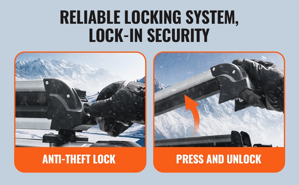 Varkaudenestolukitus kahdella avaimella auttaa pitämään varusteet turvassa pysähdysten aikana. Suuri painike mahdollistaa telineen avaamisen ja lukitsemisen helposti myös paksut talvihanskat kädessä.