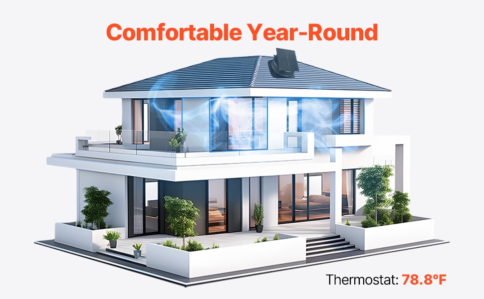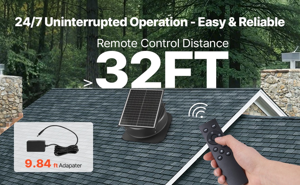Kun aurinkoenergia ei riitä, mukana tuleva älykäs verkkovirtasovitin täydentää virtaa automaattisesti, jotta tuuletin voi toimia 24/7. Langaton kaukosäädin mahdollistaa laitteen helpon ohjauksen ilman, että tarvitsee mennä ullakolle.