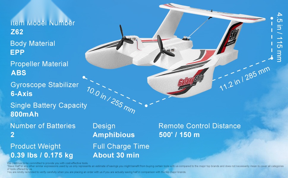 Kauko-ohjattava EPP-runkoinen amfibinen lentokone 2,4 gigahertsi kolmikanavainen kuusiakselinen gyrostabilointi kaksi akkua