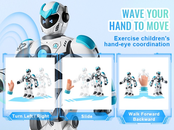 - Useita hauskoja liikkeitä ja temppuja, kuten voltit, vilkutus ja “halailu”