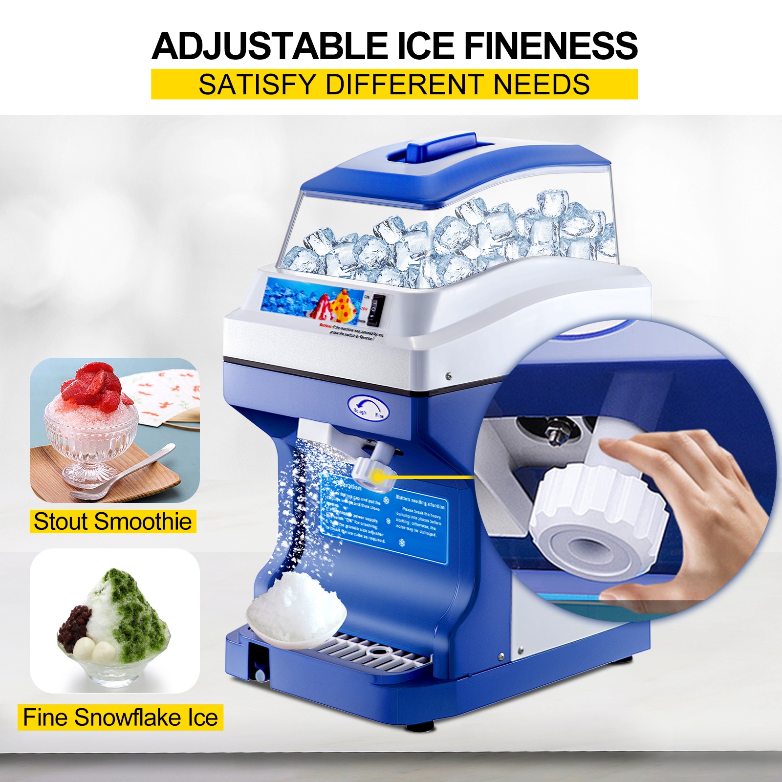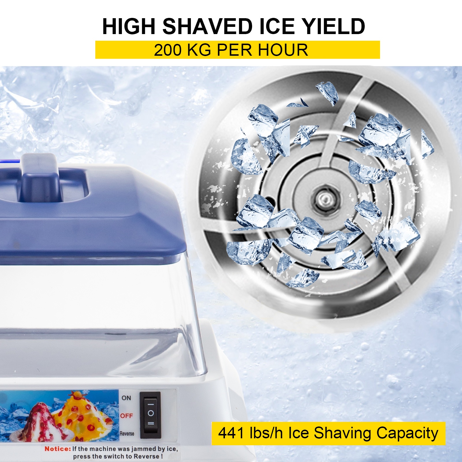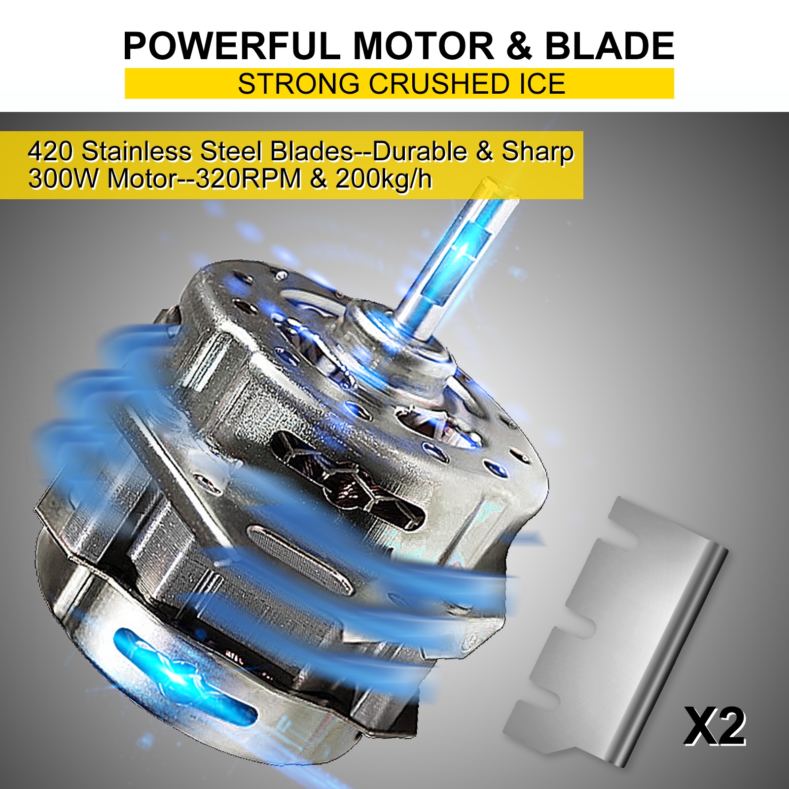 - 300 W kuparimoottori ja terävä 420-teräslaippa, jopa 441 lbs (200 kg) jäämurskaa tunnissa