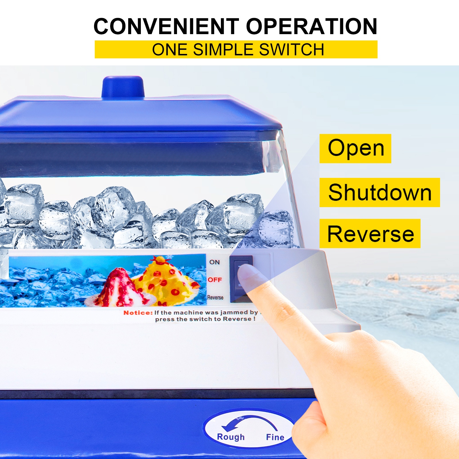 Täysautomaattinen kaupallinen jäämurskain, jossa on 5 L syöttösäiliö, sopii tehokkaaseen jäämurskaukseen ravintoloissa, kahviloissa, baareissa ja kioskeissa. Runko on valmistettu ABS-muovista ja elintarvikekelpoisesta ruostumattomasta teräksestä, ja 420-ruostumattomasta teräksestä valmistettu terä mahdollistaa nopean murskausnopeuden ja hiljaisen käynnin. Jään karkeutta voidaan säätää helposti kiertonupista.