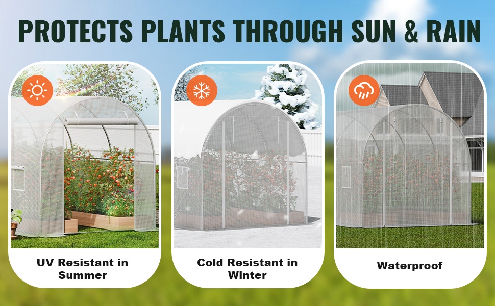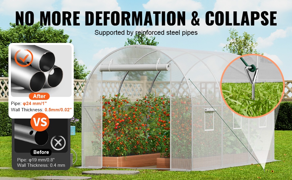 Vahvistetut 24mm/1" teräsputket, joiden seinämän paksuus on 0.5mm/0.02", yhdessä U-muotoisten maakiilojen ja muovisten koukkujen kanssa tekevät kasvihuoneesta vakaan. Rakenne kestää hyvin haastavia sääolosuhteita ja auttaa ehkäisemään vääntymistä ja painumista.