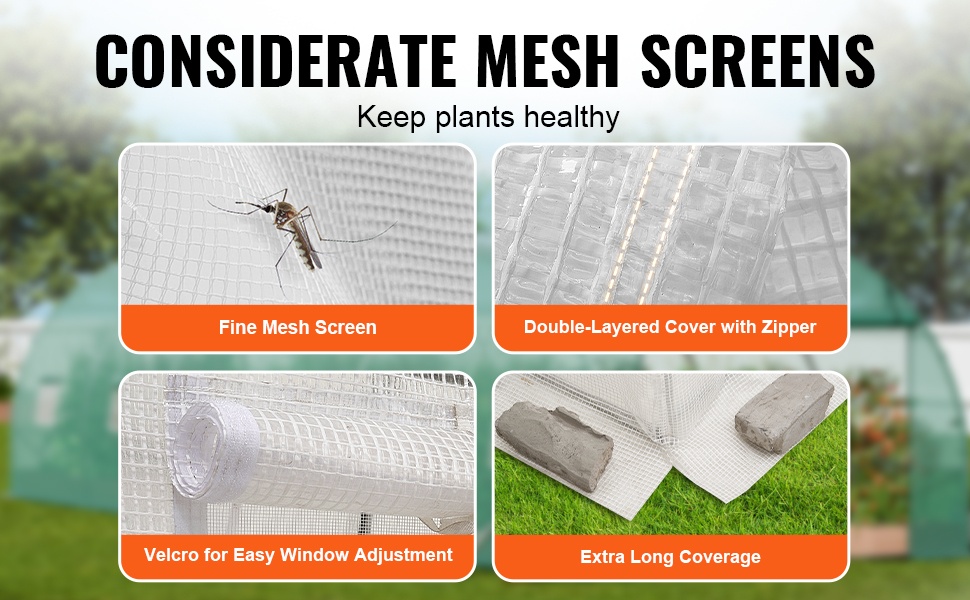 Verkkoikkunat estävät pieneläinten ja hyönteisten pääsyn sisään ja vähentävät tautiriskejä. Kaksikerroksinen peite suojaa vetoketjua, ja tarrakiinnitteiset ikkunat on helppo avata ja säätää, jotta sisäilman lämpötila ja kosteus pysyvät kasveille sopivina.