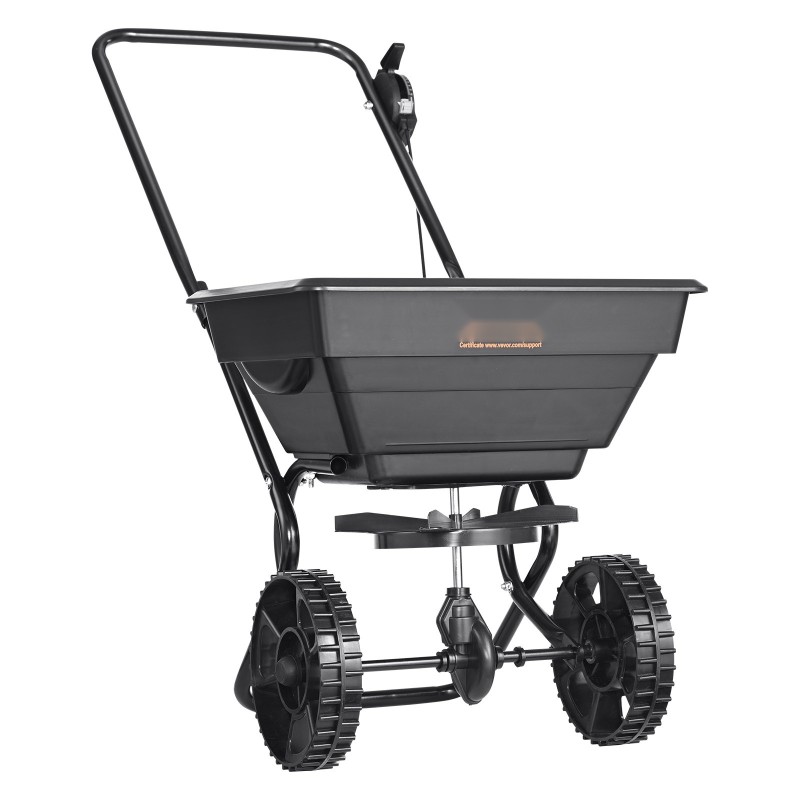 Kävelyä seuraava nurmikon levitin hiiliteräsrunko 15l 8-tuumaiset pyörät 30-portainen säätö