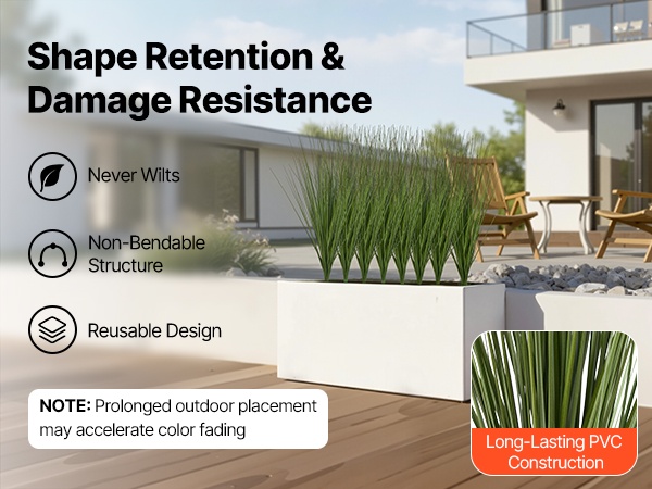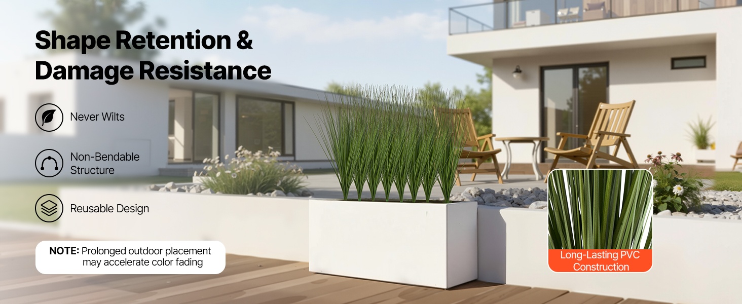 Kestävä PVC-rakenne pitää lehdet ryhdikkäinä ja muotonsa hyvin säilyttävänä. Kasvi ei vaadi kastelua, lannoitusta tai leikkaamista, ja pysyy siistinä ja vihreänä pitkään.