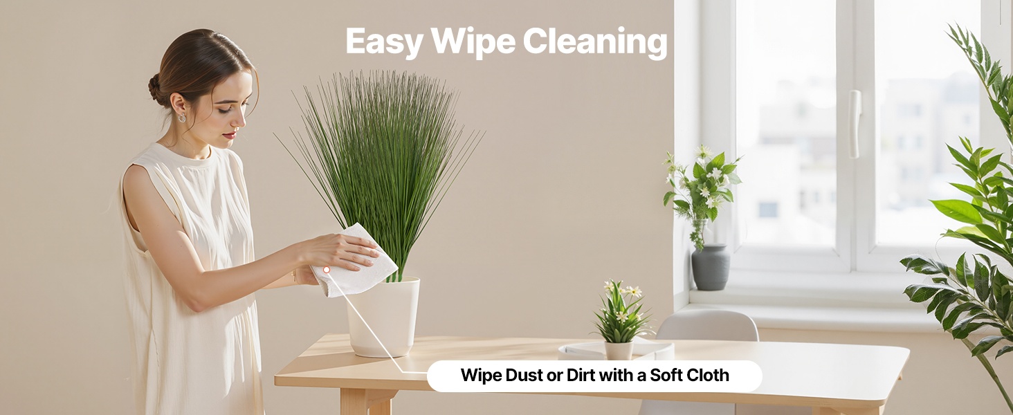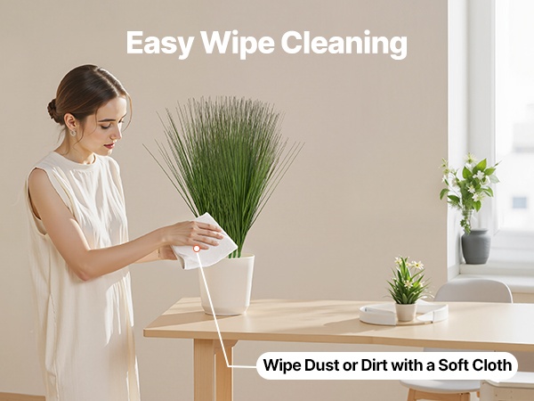 Puhdistus on vaivatonta: pyyhi pölyt ja arjen tahrat kevyesti pehmeällä liinalla. Näin kasvi säilyttää raikkaan ulkonäkönsä vähällä vaivalla.