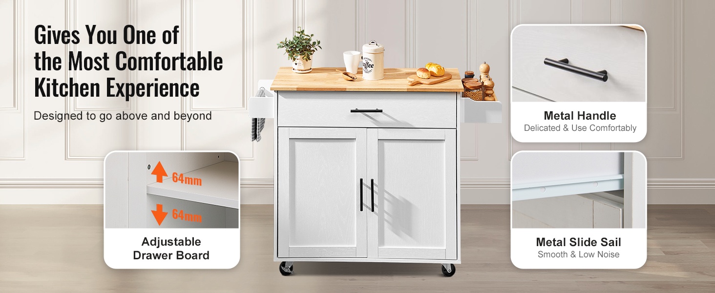 Tässä liikuteltavassa keittiövaunussa on hyllyjä, kaappeja, mausteteline sekä pyyheteline. Säädettävien hyllyjen ansiosta myös kodinkoneet ja muut suuremmat tarvikkeet on helppo sijoittaa kaapin sisälle. Alareunassa olevien pyörien avulla vaunu on helppo siirtää sinne, missä sitä kulloinkin tarvitset.