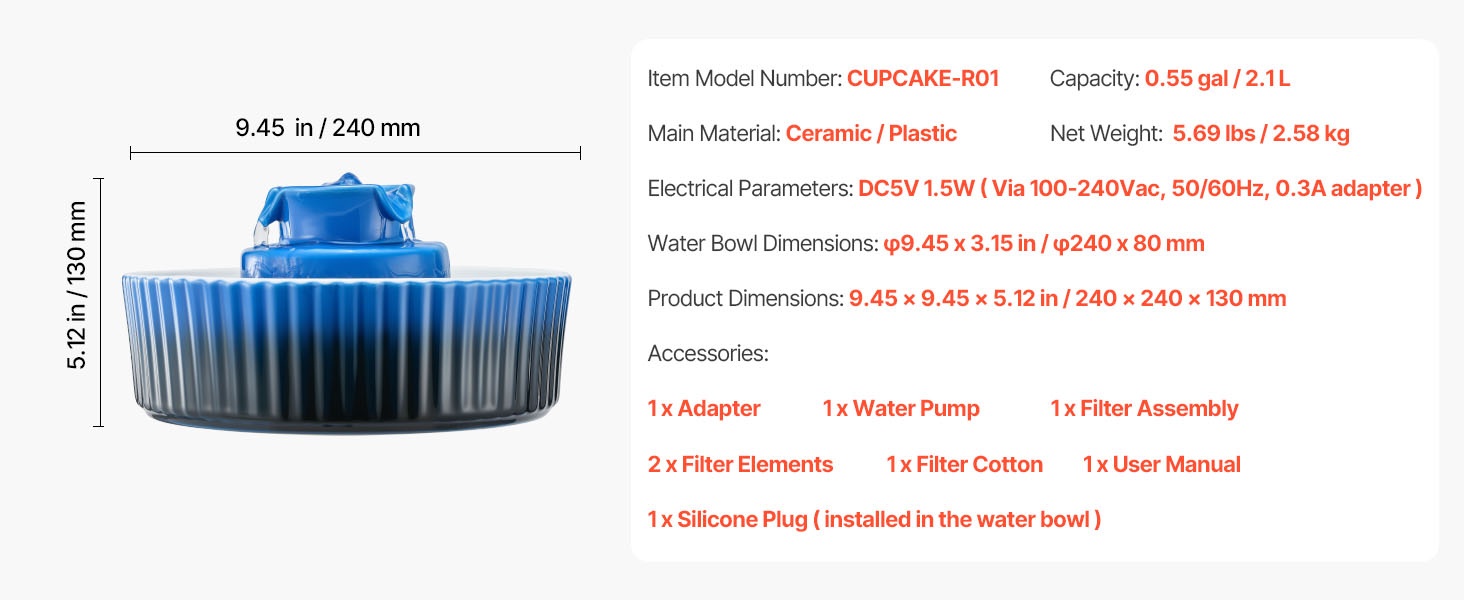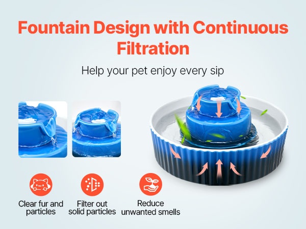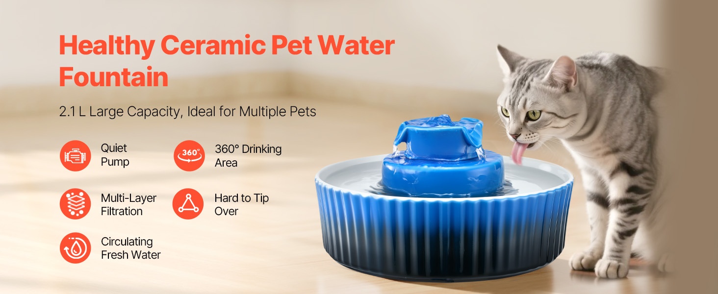Keraaminen lemmikin juoma-allas, jonka tilavuus on 2.1 L ja 360° juoma-alue. Sileä, korkeassa lämpötilassa poltettu ja naarmuuntumista kestävä pinta on miellyttävä sekä kissoille että koirille. Kaksinkertainen suodatus pitää veden puhtaana, ja erittäin hiljainen 1.5W pumppu toimii alle 30 dB:n äänitasolla.